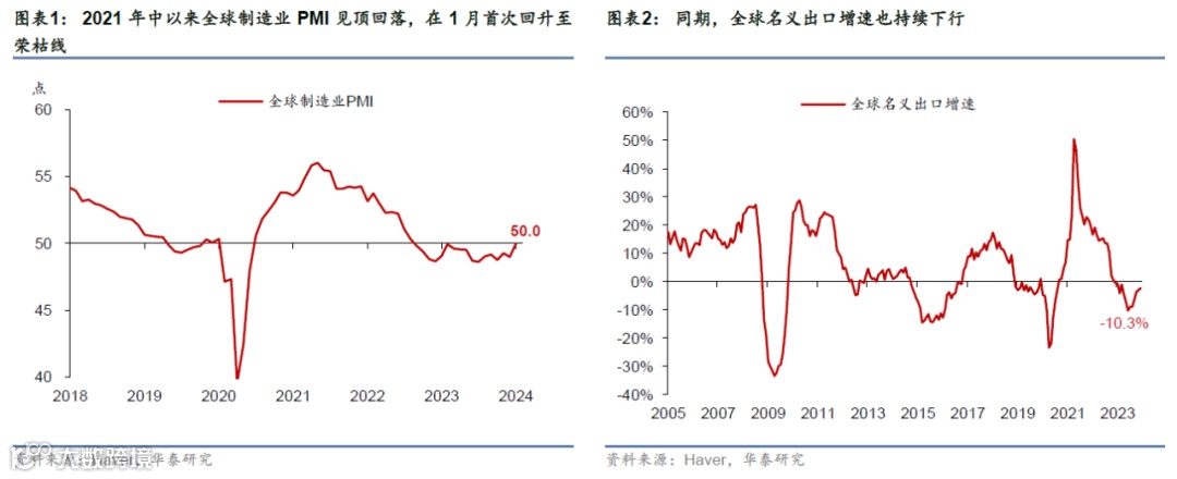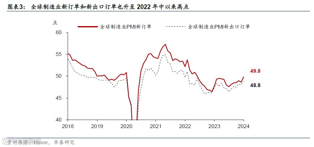 全球制造业周期或将结束长达2年的下行周期。2024年1月全球制造业PMI 17个月来首次回升至50的荣枯线;全球制造业新订单和新出口订单也回升至2022年年中以来的高点。同期,全球出口增速也企稳回升。根据韩国、中国台湾和巴西出口数据来看,1月全球名义出口增速有望继续恢复。