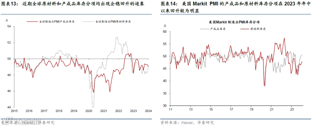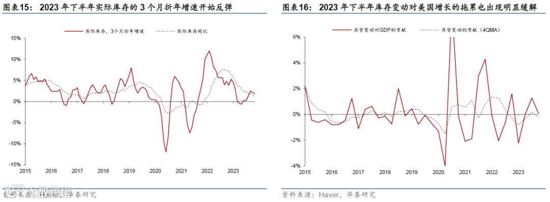 原因2:全球制造业去库存有所放缓,此前高企的隐性库存水平明显下降。如我们在《全球隐性库存周期与消失的外贸订单》(2022/8/23)中分析,疫情带来的供给瓶颈和高通胀推升了“隐性库存”,目前库存水平已经“正常化”。例如,反映隐性库存的制造商累计中间品库存在2021年一度超过历史均值两个标准差,2023年以来持续回落并低于疫情前水平(图表11和12)(参见《全球隐性库存周期与消失的外贸订单》,2022/8/23)。其他数据也显示,去库存或有所放缓。全球制造业PMI原材料库存分项在2021年底见顶回落,产成品库存分项则在2022年三季度见顶回落,近期两者均企稳回升(图表13),而美国Markit PMI的产成品和原材料库存分项在2023年年中以来回升较为明显(图表14)。从美国实际库存数据来看,虽然实际库存同比增速仍在回落,但是2023年下半年实际库存的3个月折年增速开始反弹(图表15),而2023年下半年库存变动对美国增长的拖累也出现明显缓解(图表16)。