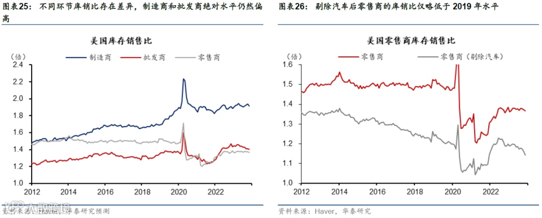 其次,去库存速度虽然放缓,但绝对库存水平偏高抑制企业库存周期。从美国企业库存销售比来看,截至2023年11月,制造业和零售商整体的库销比虽然回落至1.54,接近疫情前水平(图表24)。不同环节存在一些差异,制造业整体库销比降幅有限,与2019年持平;批发商库销比高位回落,略高于2019年水平;零售商库销比变动不大,绝对水平不及2019年(图表25)。零售商库销显著低于2019年水平,这主要是因为疫情和俄乌冲突冲击全球汽车供应链,导致汽车供需错配,零售商汽车库存明显下降。2022年底以来,随着全球汽车供应链的修复,零售商的汽车库存已经有所上升,但还不及2019年的水平。剔除汽车库存,零售商的库销比仅略低于2019年水平(图表26)。