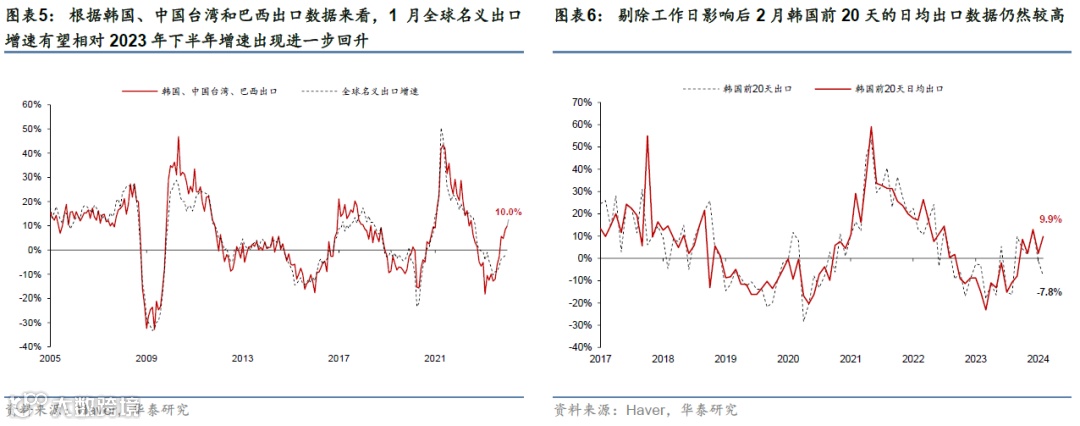 同期,全球出口增速也企稳回升。根据韩国、中国台湾和巴西出口数据来看,1月全球名义出口增速有望相对2023年下半年增速出现进一步回升(图表5)。从韩前20天的日均出口数据来看,2月出口增速仍然有望维持相对较高水平(图表6)。