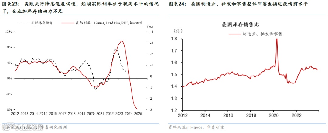 首先,当前实际利率的绝对水平仍然偏高。尽管降息周期可能开启,但经济韧性较强或导致美欧降息速度偏慢,从而使得短期政策利率回落较慢。此外,通胀回落推高实际利率,抑制企业加库存。