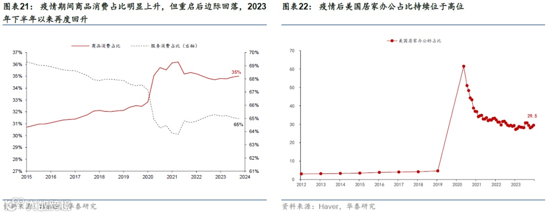 原因4:美日制造业企业资本开支上行有望边际提振企业部门商品需求,居民部分商品消费也有所修复。2023年四季度美国企业设备投资增速,尤其是计算机等IT设备明显改善;日企的乐观情绪同样较高,也一定程度支撑企业投资(图表19和20)。从居民部门来看,2022年以来,疫情后商品转服务趋势导致商品消费弱于服务消费,商品在总消费中的占比有所下降,服务消费有所回升。但2023年下半年以来,商品转服务的趋势有所放缓,商品消费整体强于服务消费,商品消费占比再次出现回升(图表21)。考虑到疫情后美国居家办公持续位于高位(图表22),而居家办公将推高商品需求,但降低与工作场所相关的服务需求,预计美国消费中商品占比偏高的趋势或能够持续。