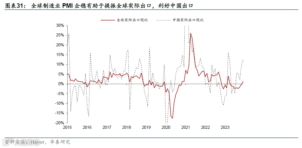 考虑到中国制造业竞争力继续上升,制造业周期温和回升有望支撑中国出口增长,往前看,后续持续性主要看中美制造业产能周期的综合强度。中国出口具有全方位的成本和效率优势,预计中国出口在全球出口中的份额仍可能继续上升或者保持在较高水平(参见《中国出口产业链的升级与重塑》,2023/4/18)。全球制造业周期温和回升有助于提振全球实际出口,利好中国出口(图表31)。往前看,中国出口的持续性主要看中美制造业产能周期的综合强度。若美国增长出现明显下行风险,出口回升的空间或受限。
