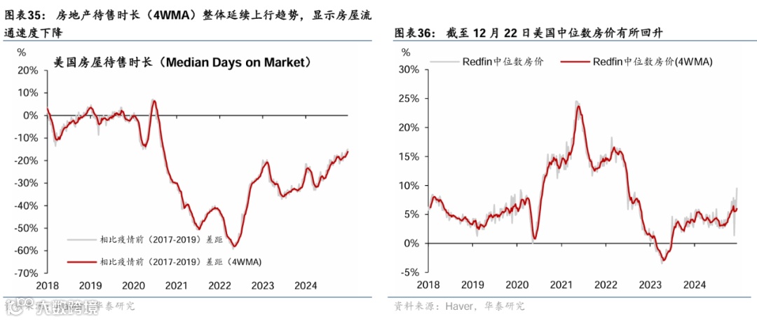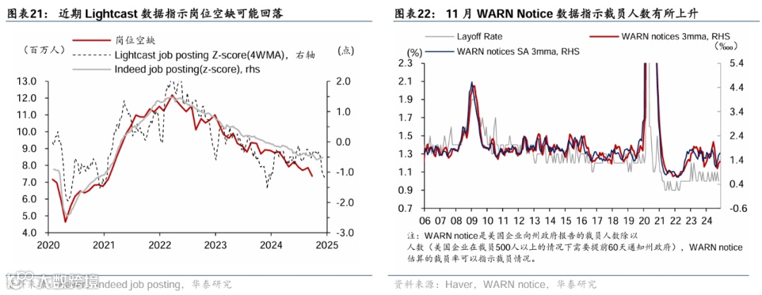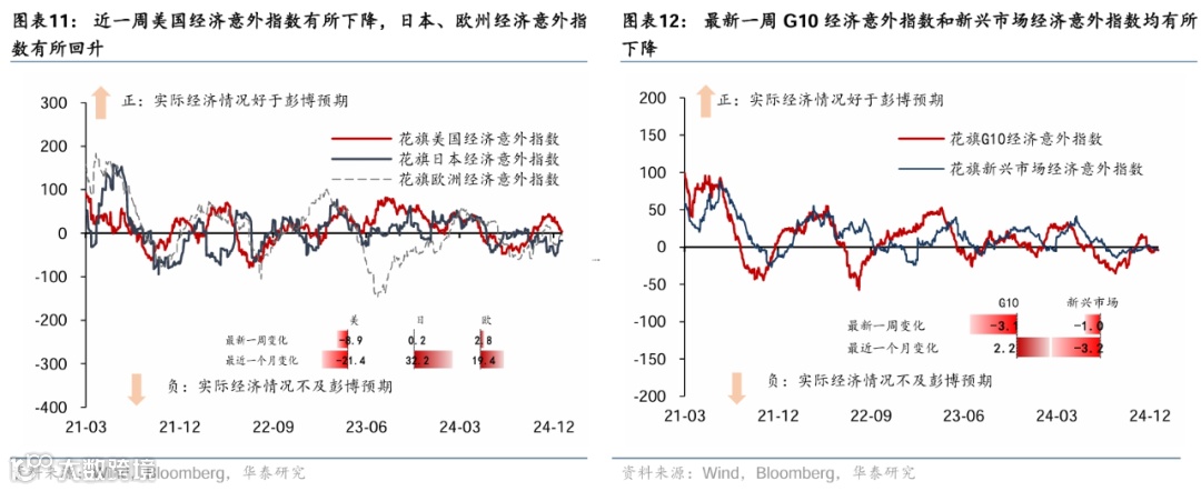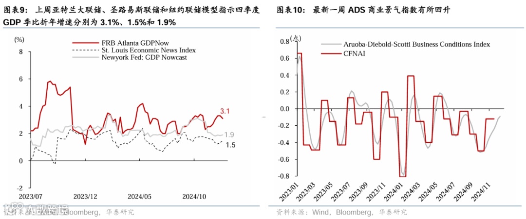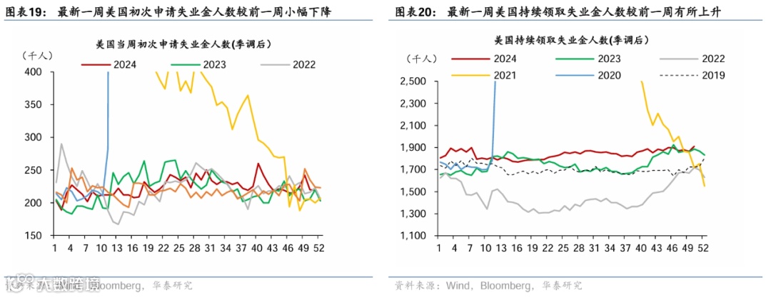 高频数据显示美国消费维持韧性,就业数据喜忧参半,房贷利率回升、住房需求持续偏弱。消费方面,上周实际个人消费的Nowcast维持在3.2%的相对高位,反映美国消费韧性仍偏强。就业市场方面,美国失业数据喜忧参半,首申人数超预期回落(实际21.9万人,预期22.3万人),续申人数升至三年多来最高(实际191万人,预期188.1万人),反映失业者需要花更长时间才能找到工作。地产方面,30年期固定利率房贷利率回升至6.85%,房地产待售时长延续上行趋势,Redfin房屋销量小幅下降,房地产市场仍然承压。
