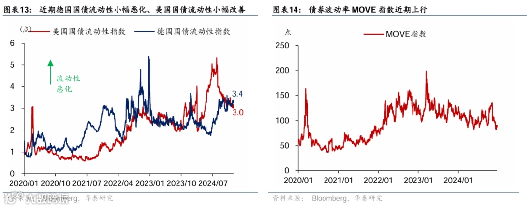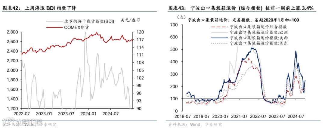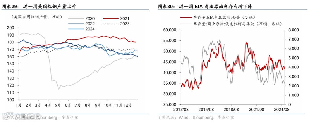 上周美债收益率抬升,美国三大股指均上涨,大宗商品涨跌不一。市场对2025年累计降息幅度预期由37bp下降至35bp,2年和10年期美债收益分别上升1bp/10bp至4.31%/4.62%,10年期美债收益率徘徊七个月最高。同期,美国政府避免停摆后使美元指数小幅上行0.2%至108;欧元兑美元基本持平于1.04;日元贬值0.6%至157.8。美国三大股指均上涨,标普500、纳斯达克和道琼斯指数分别上涨0.7%、0.8%、0.4%。大宗商品涨跌不一:COMEX黄金期货下跌0.5%至2616.4美元/盎司,LME现货铜上涨0.6%至8843美元/吨;布伦特原油上涨0.9%至74.3美元/桶。
