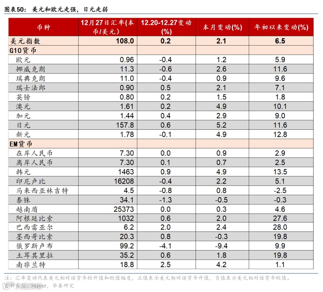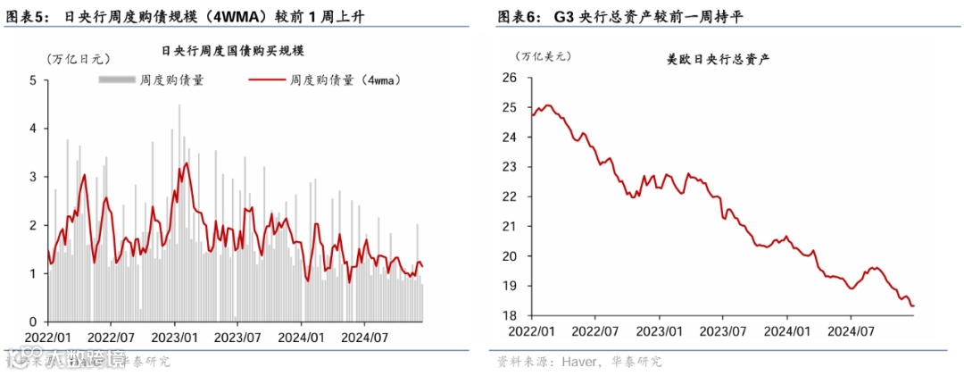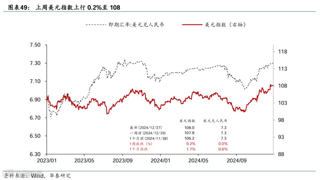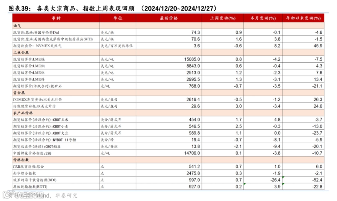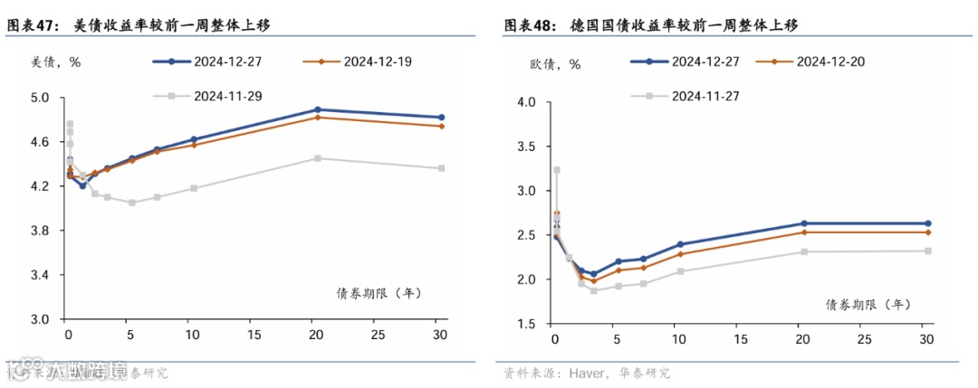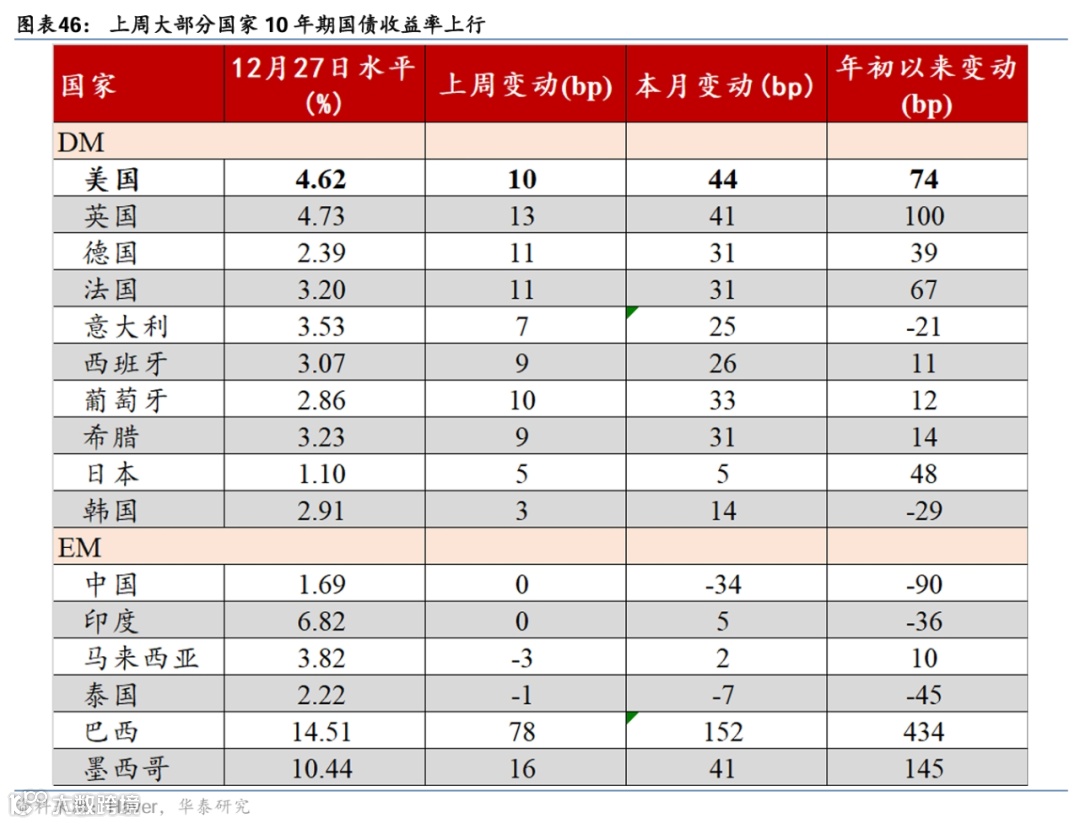 欧央行行长拉加德称须对服务通胀保持警惕,日央行内部或存在分歧,1月加息仍有可能,耶伦警告债务上限问题,韩国代总统弹劾动议通过。欧洲央行行长拉加德称,欧洲央行非常接近2%的通胀目标,但仍须对服务通胀保持警惕,服务业的价格涨幅几乎是欧洲央行目标的两倍。日央行12月会议纪要显示关于加息时点存在内部分歧,1月加息仍有可能。此前日央行行长植田和男重申关注特朗普和“春斗”风险,但对下月加息闭口不提,并表示在下次加息之前,需要仔细审视特朗普上任后的政策立场和明年的工资谈判前景;而考虑到日元持续贬值会带来通胀压力,日本央行多位高官在12月会议纪要中表达了加息的必要性。耶伦警告美国国会:明年1月中政府债务上限到期,财政部需动用超常规手段避免违约。韩国政治不确定性加剧,韩国反对党提交的对代总统韩德洙的弹劾动议投票通过。