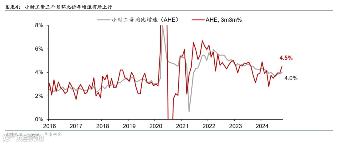 2)10月小时工资环比增速上行0.06pp至0.4%,其中服务部门工资增速有所上升,商品部门工资增速小幅回落。整体来看,小时工资三个月环比折年增速反弹至4.5%,超过前三季度均值(图表4)。分项看,服务部门小时工资环比上行0.1pp至0.4%,主要系信息业、公用事业、零售业、运输仓储业环比回升推动,商业服务、教育和保健服务业环比增速放缓。商品部门小时工资环比回落0.1pp至0.3%,仅耐用品制造业薪资环比小幅回升,其余行业普遍下行。
