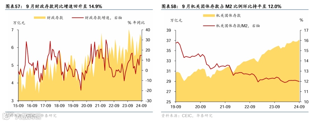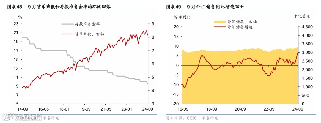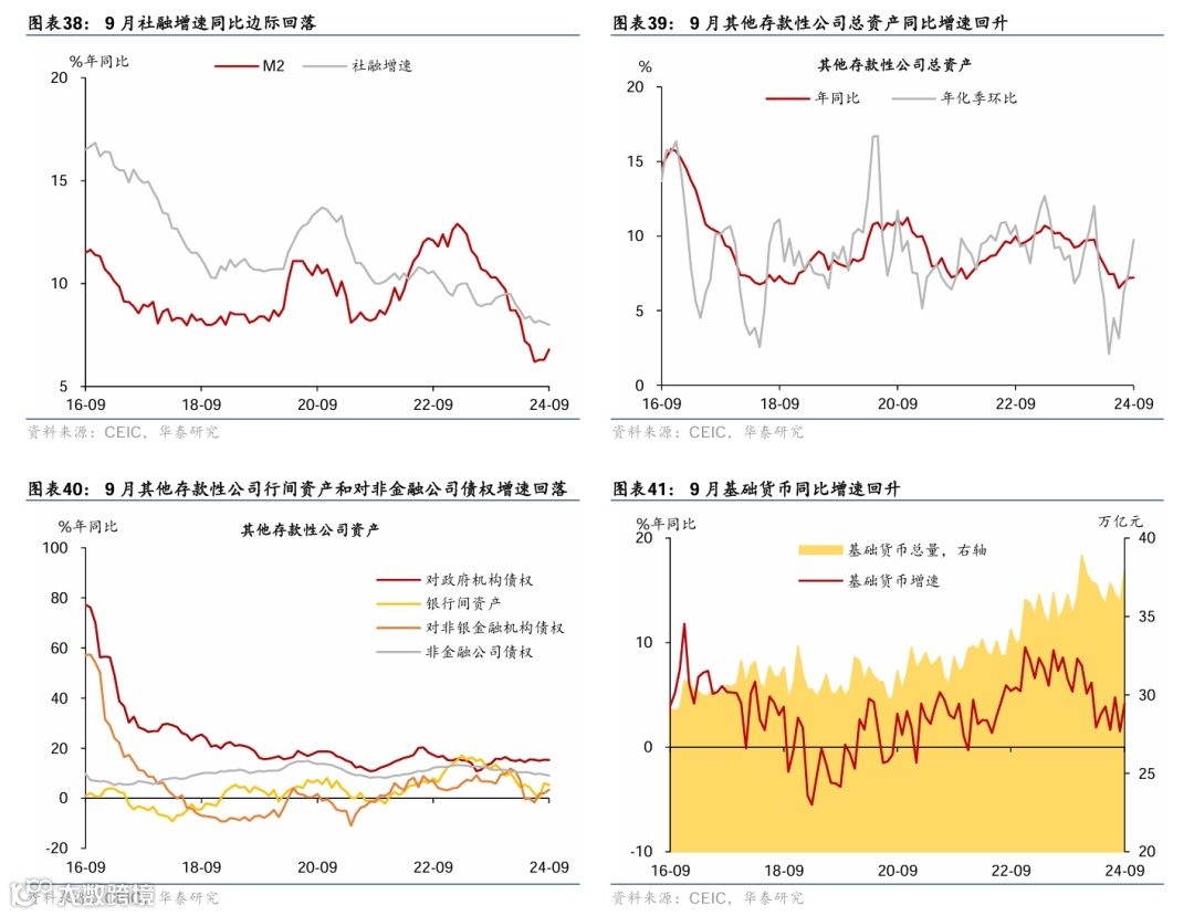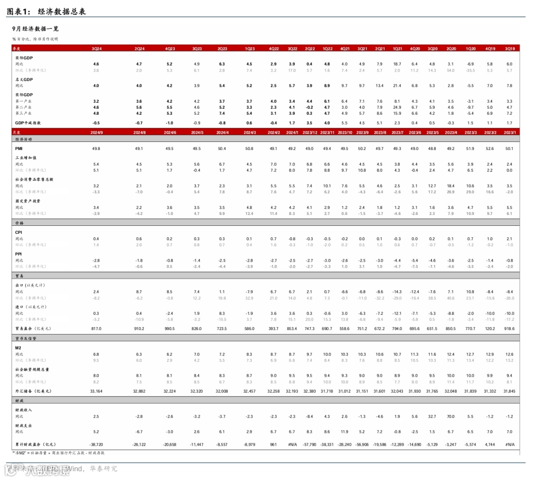 9月重要宏观数据回顾:1)3季度GDP增长较2季度减速至4.6%,9月工业增加值/社零/固定资产投资同比增速回升至5.4%/3.2%/3.4%。2)9月美元计价出口/进口同比增速从8月的8.7%/0.5%回落至2.4%/0.3%。3)9月中国CPI同比较8月的0.6%回落至0.4%,PPI同比降幅较8月的1.8%走阔至2.8%。4)9月新增社融3.76万亿元,同比少增3,722亿元,仍主要由政府债与票据融资拉动,M2同比增速从8月的6.3%上行至6.8%,主要受非银存款同比大幅多增提振。