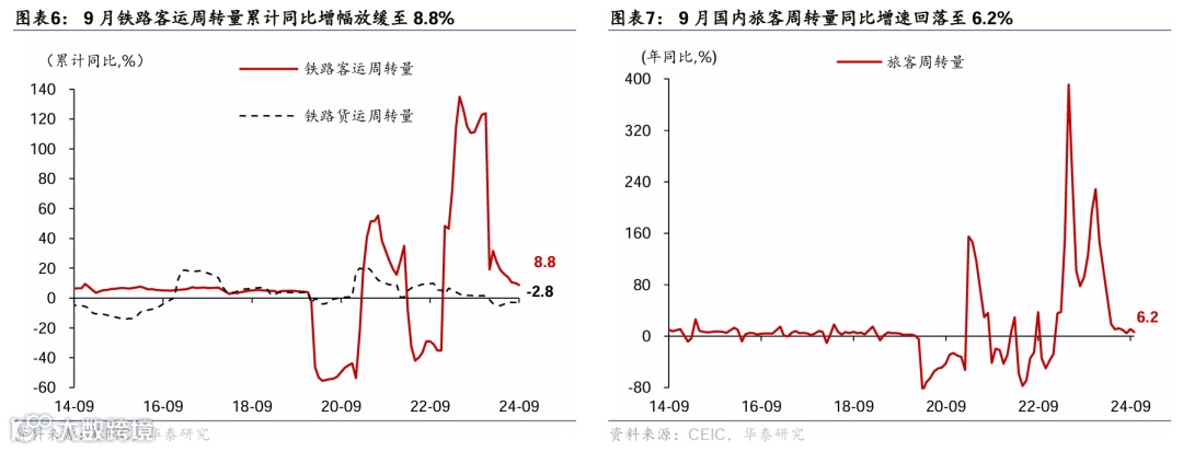 国庆假期旅游消费呈现温和回升,10月汽车销售同比改善,工业生产环比回升,地产成交回暖、尤其是一线城市二手房同比走强。出行及消费方面,国庆假期旅游人次及消费金额同比增长约5.9%/6.3%,10月1-30日,18城地铁客运量同比回升2.5%、国内航班数量亦同比回升1.5%。10月1-27日,乘用车日均零售销量同比增速较9月的2%上行至9%。物流增速同比回升,10月1-30日,整车货运物流/公共物流园区吞吐指数同比较9月的-2%/-5.4%上行至2.4%/0%;出口高频指标HDET显示10月出口环比持续回落,但低基数提振同比读数。工业生产总体环比提速,高炉/焦化/水泥开工率月均环比回升3.1/4.3/2.5ppt,而建筑钢材成交量月均环比回落0.4%。商品房成交同比回暖,10月1-30日,60城新房/26城二手房成交面积同比较9月的-27.1%/-4.2%回升至-4.2%/8.1%,其中一线城市二手房成交同比较9月的1.8%大幅回升至71%。