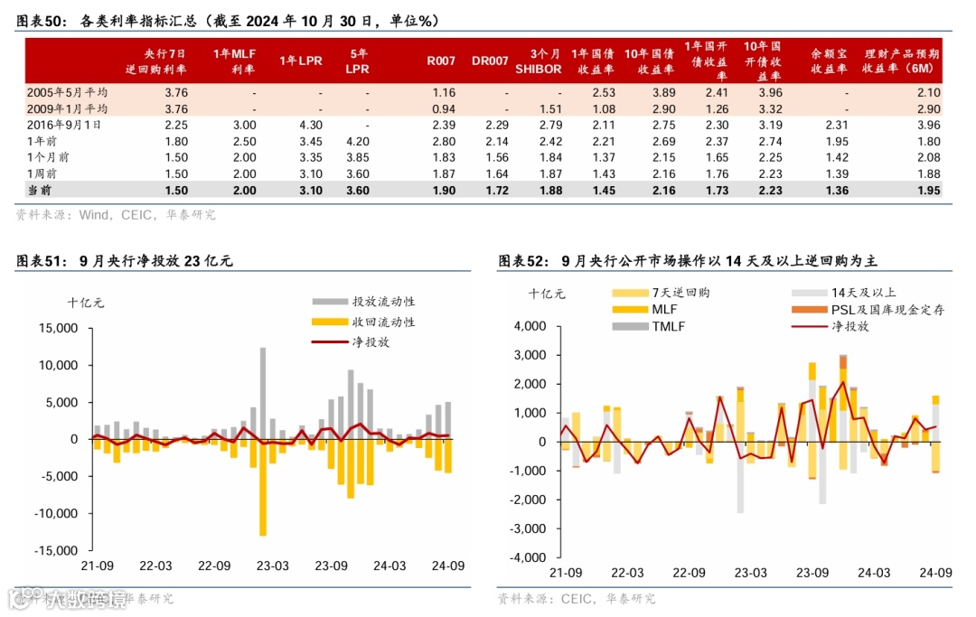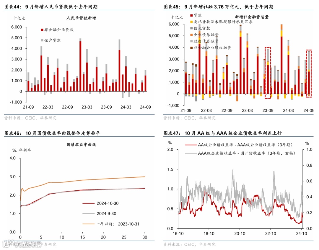 金融市场:10月LPR对称下调25个基点,为19年LPR报价改革以来最大降幅;MLF缩量平价续作7,000亿元;10月利率债净发行同比少增。截至10月30日,1/10年期国债收益率较9月末分别上行8/1bp;银行间流动性偏紧,R007/DR007月环比上行7/16bp。10月国债、地方债和政策性银行债合计净发行1.23万亿元,同比少增4,705亿元。汇率方面,截至10月30日,人民币兑美元汇率回撤1.5%、兑一篮子货币回升1.5%。