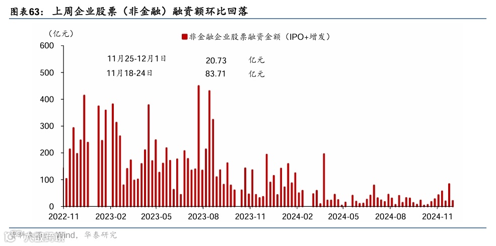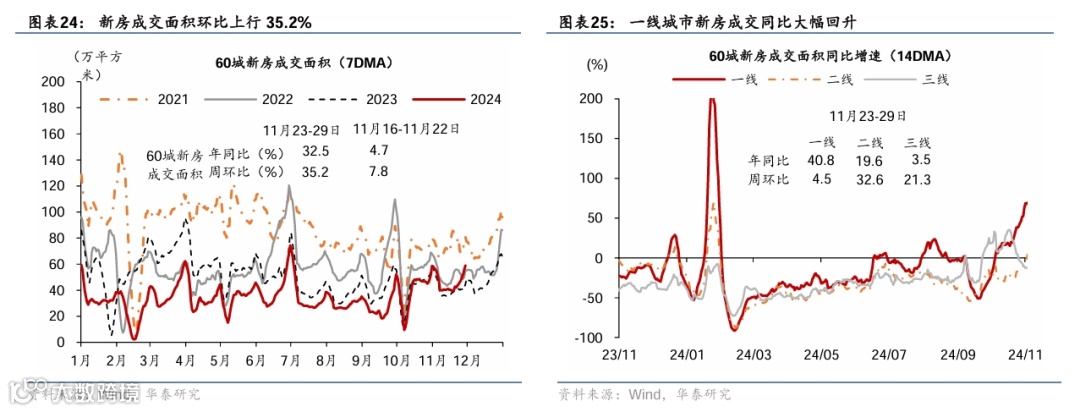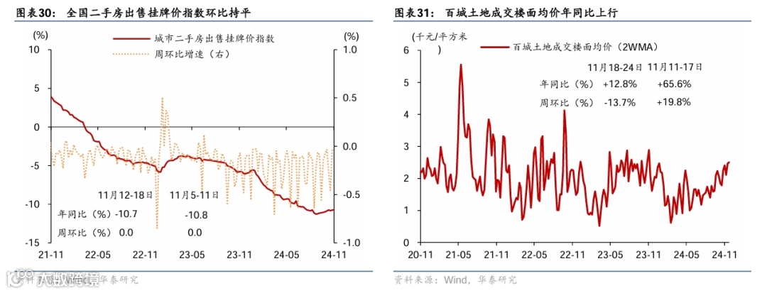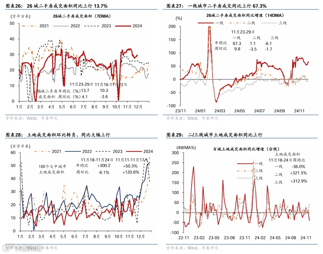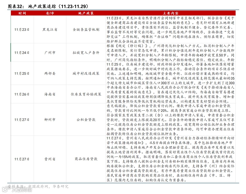 地产政策方面:1)11月24日,根据《规定(修订稿)》,广州将优化积分制入户方式。取消积分制入户年度名额限制,实行常态化申请,累计积分分值达到年度积分制入户分数线即可申请入户,并放宽积分制入户年龄限制,申请年龄由45岁放宽至50岁。同时,广州简化指标条件,明确积分制入户指标由稳定居住、稳定就业、年龄3项指标组成。2)11月25日,住房城乡建设部、财政部联合印发通知,部署各地加快落实增量政策措施要求,进一步做好城中村改造工作,推动符合条件的项目尽快启动实施。上述通知明确,地级城市资金能平衡、征收补偿方案成熟的项目,均可纳入政策支持范围。按照通知要求,城中村改造政策支持范围从最初的35个超大特大城市和城区常住人口300万以上的大城市,进一步扩大到了近300个地级及以上城市。3)11月27日,贵州省人民政府办公厅印发《贵州省全力推动经济持续回升向好若干政策措施的通知》,从5方面提出19条具体措,其中包括推动房地产市场止跌回稳、支持房地产开发企业合理融资需求、提高商品房开发质量以及提高土地资源利用率。措施明确,落实好商业性个人住房贷款最低首付款比例统一为15%的政策,取消首套住房和二套住房商业性个人住房贷款利率政策下限。