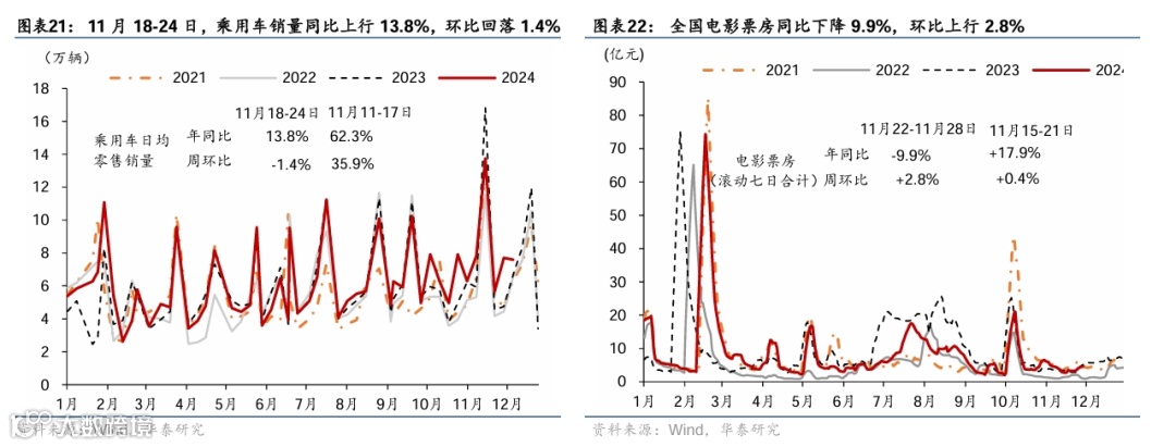 线下消费:汽车零售同比增加、环比回落,电影票房环比持续回升,但低于去年同期。11月18-24日乘用车日均零售销量同比高于历史同期13.8%,环比增速回落至-1.4%。政策支持、新能源汽车快速发展、车企促销策略以及宏观经济复苏推动消费者购车需求释放,11月1-24日累计同比增长29%。此外,11月22-28日,全国电影票房环比上行2.8%,低于去年同期9.9%。
