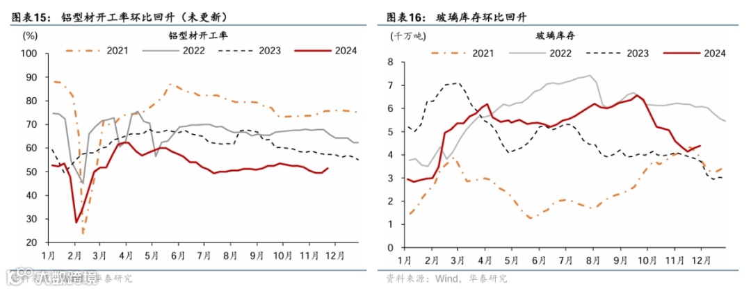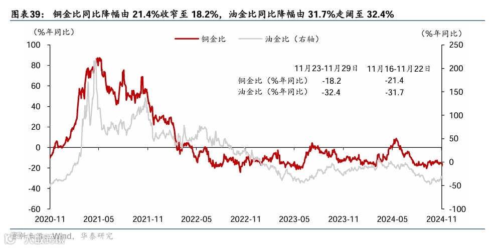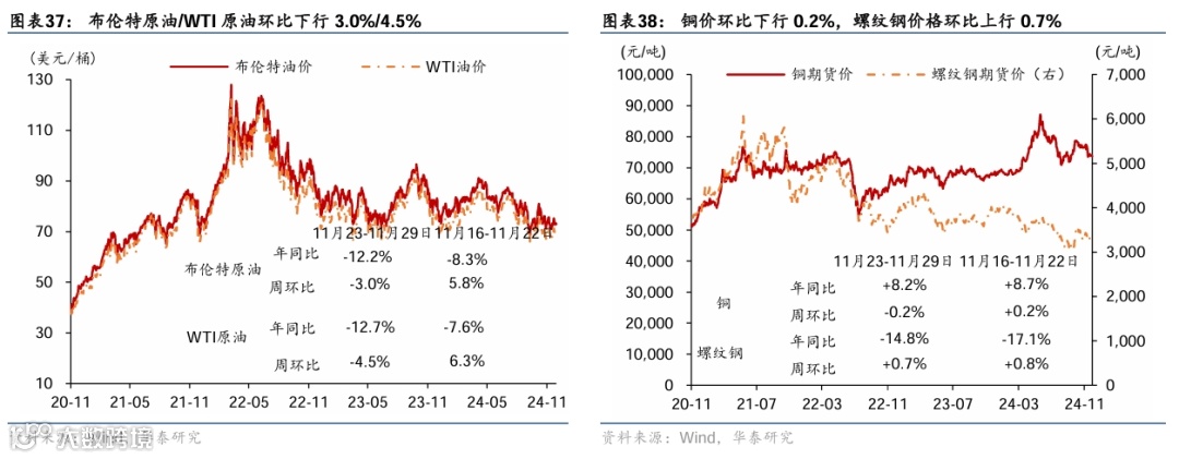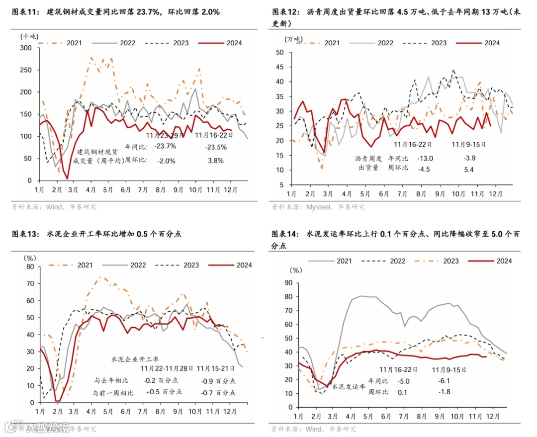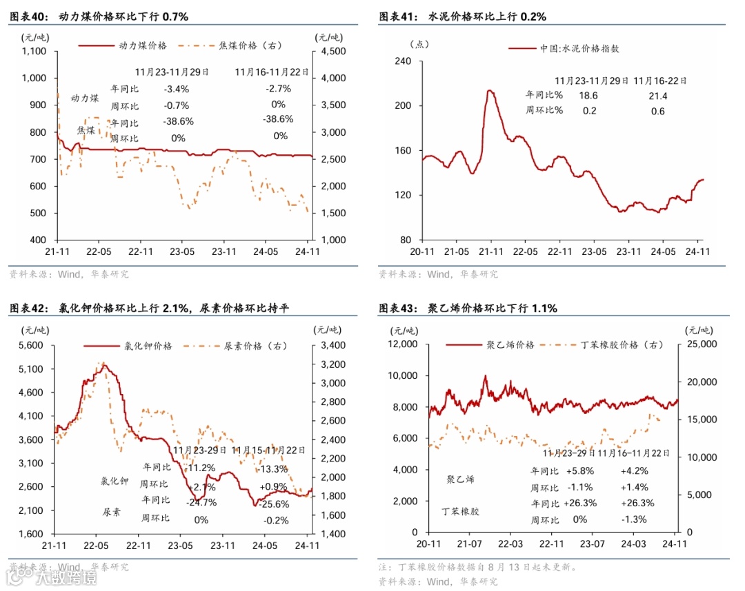 下游:水泥开工率环比回升、同比小幅下降,建筑钢材成交同比降幅走阔、环比下行。具体看,上周水泥企业开工率环比增速回升至0.5个百分点,同比下降0.2个百分点。11月23-29日,建筑钢材日均成交量环比回落2.0%,同比降幅走阔至23.7%。此外,半钢胎开工率较前一周小幅下降0.1个百分点,高于2023年同期6.5个百分点、显示汽车供给侧景气度仍较高。