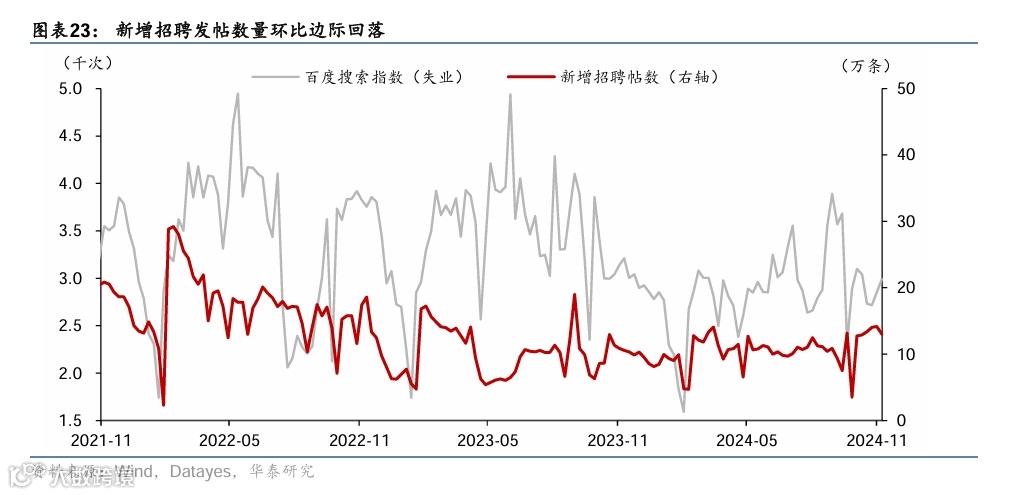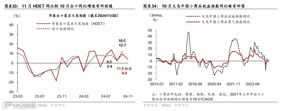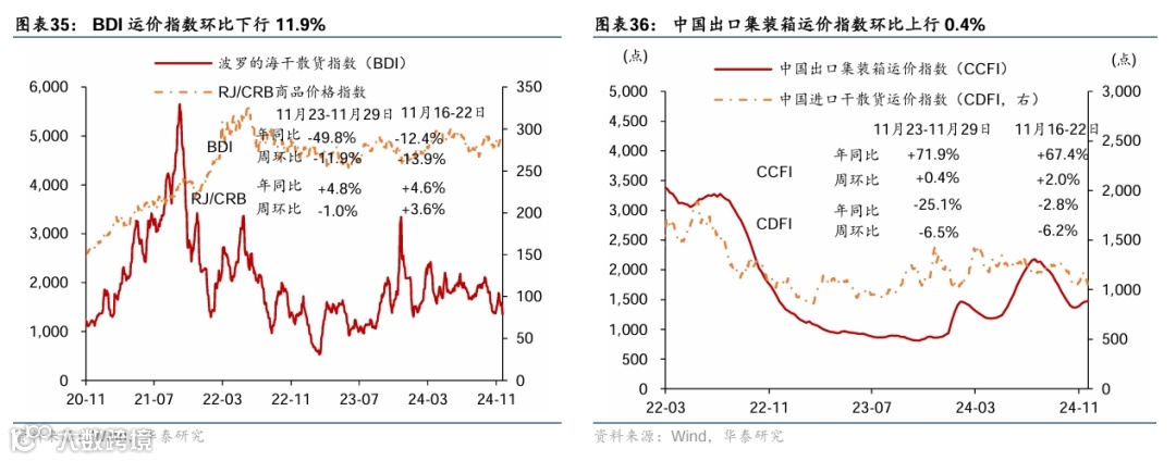 外贸需求:国际航线运价整体回落,中国出口集装箱运价指数环比上行。截至11月22日,中国进口干散货运价指数(CDFI)较前一周环比回落6.5%,BDI指数较前一周环比下行11.9%。此外,高频指标华泰出口需求日度指数(HDET)显示高基数下11月出口同比增速或较10月有所放缓。