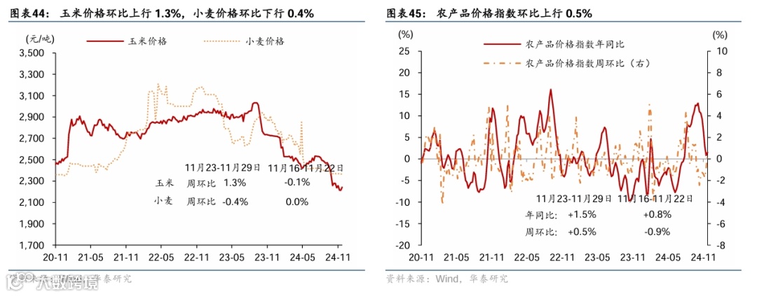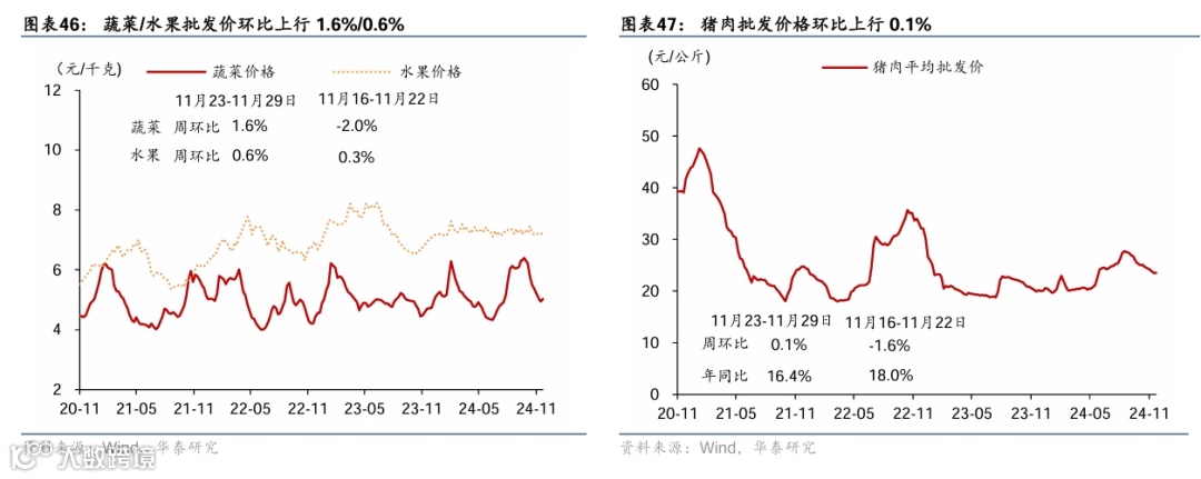 农林牧渔:猪价月均环比转负、生猪养殖仍然录得盈利且环比有所回升。1)猪肉价格11月至今月均环比回落4.6%,需求偏弱仍对猪价回升形成制约;生猪养殖利润周环比回升27.5%,但已连续28周录得正利润,全月平均环比回落29.6%。2)粮价仍在回撤,11月至今小麦/玉米价格环比回落0.1%/1.7%。
