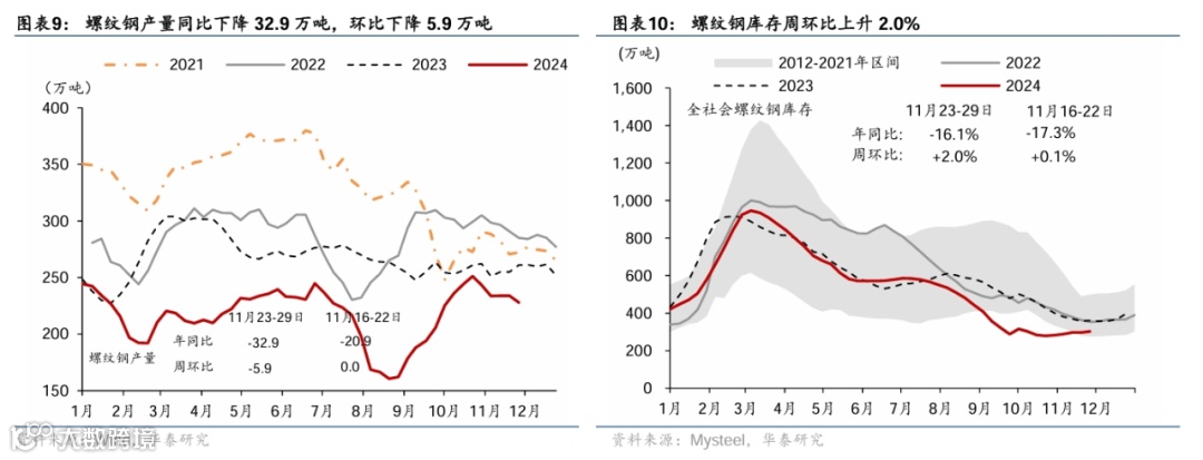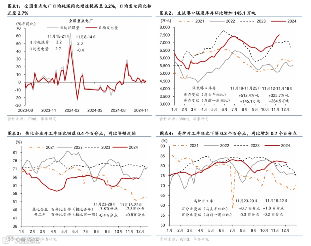上游:上周(11月23-29日)焦化开工率同比降幅走阔,环比回落,高炉开工率同比上行、环比小幅下降。11月15日-21日,全国重点电厂日均耗煤同比增速提高至3.2%,日均发电同比转正至2.7%。11月19-25日,主流港口煤炭库存环比季节性增加145.1万吨、同比增加512.4万吨。11月23-29日,全国247家样本高炉开工率环比下降0.3个百分点,高于去年同期0.7个百分点。此外,焦化企业开工率环比回落0.4个百分点,低于去年同期7.8个百分点,同比降幅较前一周小幅走阔。