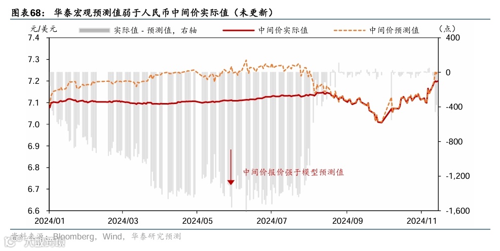 2)2024年11月制造业PMI较10月的50.1%小幅上行至50.3%、高于彭博一致预期的50.2%,而非制造业商务活动指数小幅回落至50%,略低于彭博一致预期的50.4%。国内稳增长政策持续发力推动内需延续9月以来的改善迹象,11月制造业PMI中生产及新订单指数均延续上行态势,生产指数和新订单指数分别较10月上行0.4/0.8个百分点至52.4%/50.8%,同时,11月新出口订单指数自今年8月以来再度上行、或显示关税预期下的“抢出口”效应凸显。但价格指标再度回落,购进/出厂价格指数环比回落3.6/2.2个百分点至49.8%/47.7%,或显示11月PPI价格及工业企业利润改善仍承压。