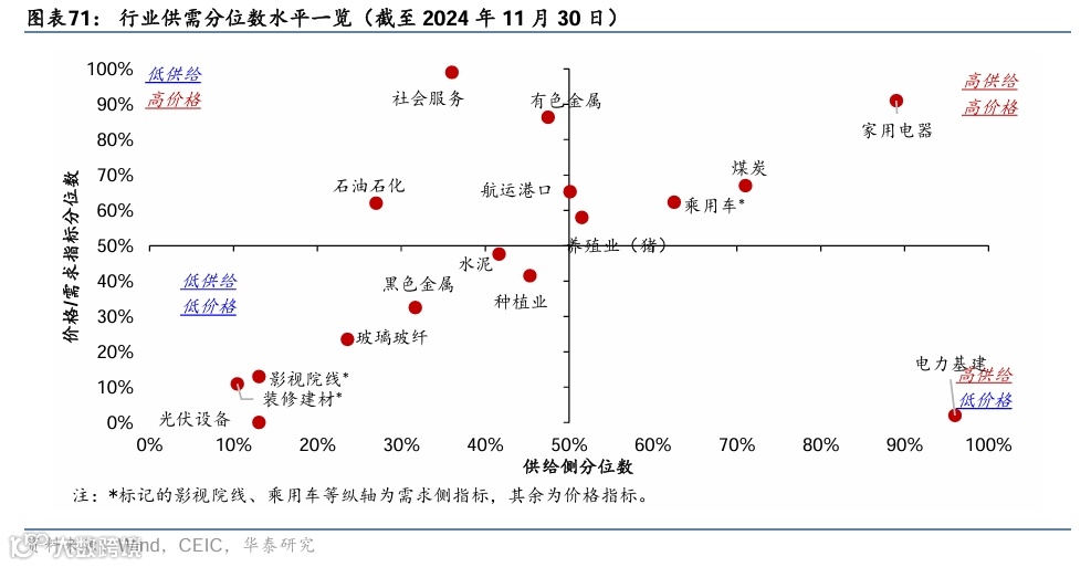 黑色金属、种植业、光伏设备、水泥和装修建材等行业所在分位数水平处于低供给、低需求区间,体现上述行业供需两侧均有所承压。通信产品、锂电池和光伏设备的价格水平仍在低位。