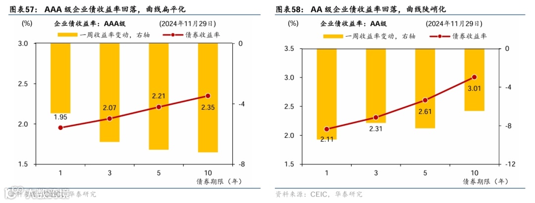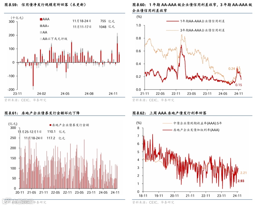 融资及汇率:AAA级企业债收益率回落,AA级企业债收益率回落,3年期AA-AAA级企业债信用利差收窄。上周房地产债净发行额环比下降,股权融资额环比回落。上周沪深300指数环比回升1.78%,PE(TTM)估值水平较前一周边际回升。汇率方面,上周人民币兑美元较一周前上行0.17%,对一篮子货币汇率较前一周下行0.09%。此外,上周利率债净发行11,075亿元,同比多增9,400亿元,其中国债同比少增178亿元,地方政府债同比多增8,736亿元,政策性银行债同比多增843亿元。