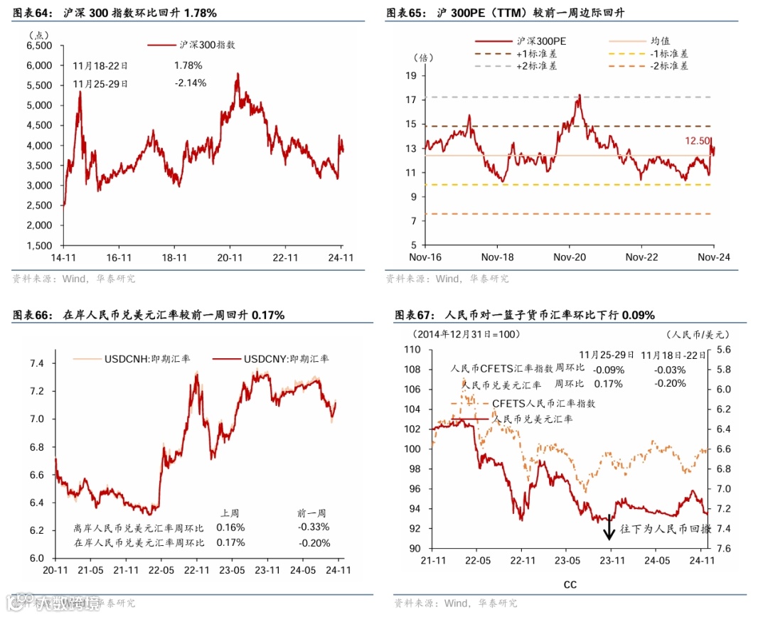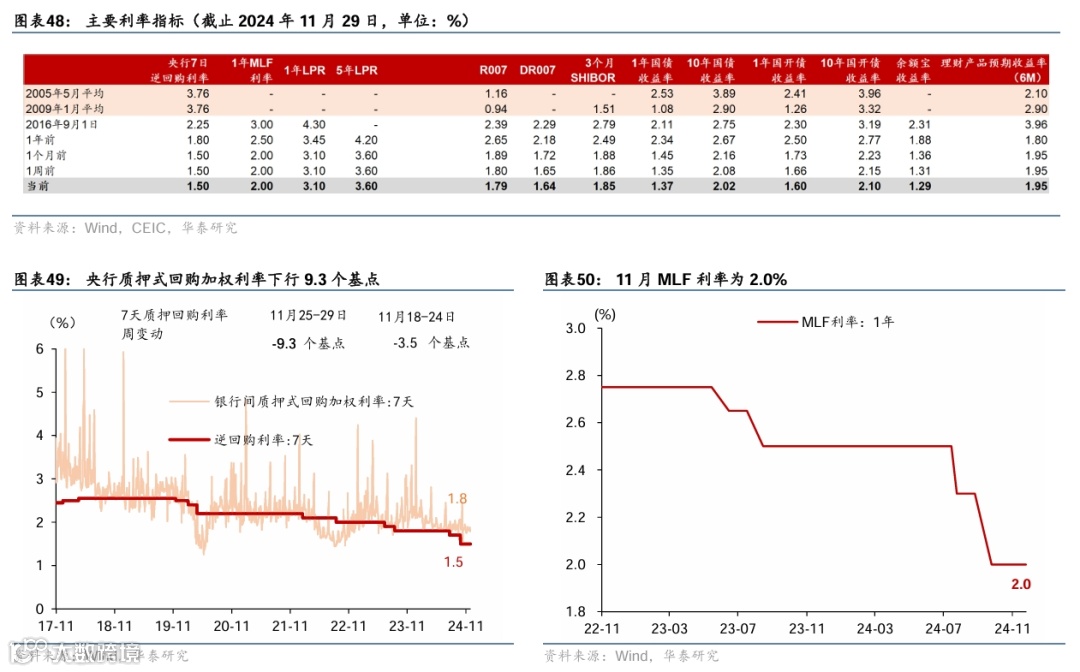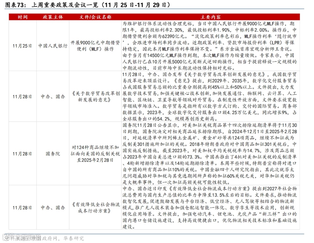 事件:1)中国人民银行25日开展9000亿元中期借贷便利(MLF)操作,中标利率2%,较上月持平;11月买断式逆回购操作8,000亿元;2)国务院公告显示,对124种商品继续不加征面向美国的反制关税至2025年2月28日;3)国务院发文部署降低物流成本,鼓励发展与平台经济、低空经济、无人驾驶等相结合的物流新模式,加强支持“新三样”高效出口。