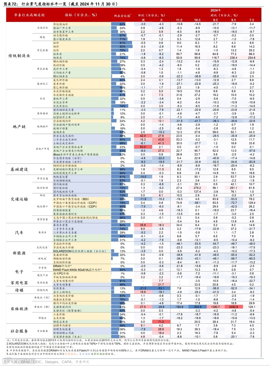 制造业:国际油价周环比仍在回落,有色金属价格亦再度整体走低。1)石油石化:11月至今布伦特原油价格月均环比回落4.3%,上周环比回落3%;沥青装置开工率月环比平均上行5.9个百分点。2)煤炭:动力煤价格月均环比边际回落0.1%、港口煤炭库存月均环比小幅上行1.2%。3)有色金属:国际铝、铜等有色金属价格位于91%-93%的高分位水平,其中国际铝/铜价上周环比下行0.5%/0.3%,11月至今国际铝/铜均价涨跌互现;库存方面,上周铝库存回落1.8%、铜库存亦下行0.6%,但仍位于2013年以来74%的较高分位数水平。4)黑色金属:螺纹钢/线材价格11月均价环比回落2.4%/4.2%;库存方面,螺纹钢库存周环比回升2%、绝对水平仍位于4%左右较低分位数水平;5)基础化工品价格表现分化,氯化钾/聚乙烯价格11月至今均价环比回升3.1%/1.7%,而尿素价格11月至今均价环比回落1.9%。