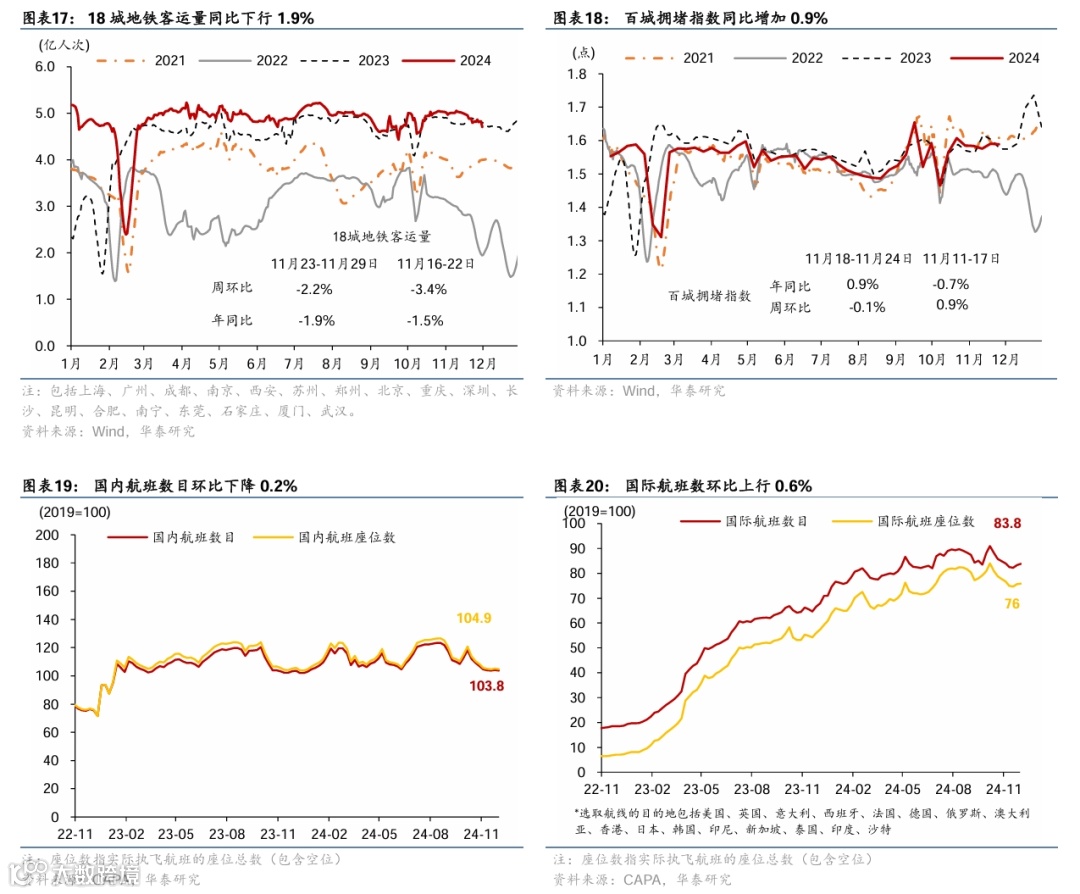 出行活动:百城拥堵指数环比小幅下降,但高于去年同期。地铁客运量同环比均下行。国内航班数量下降,国际航班数量回升。11月23-29日,18城地铁客运量周环比降幅收窄至2.2%,同比下降1.9%。此外,11月18-24日,百城拥堵指数周环比下降0.1%,同比转正至0.9%。城际/国际出行方面,国内航班数量环比下降0.2%,国际航班数量环比上行0.6%,分别为2019年同期的103.8%/83.8%。