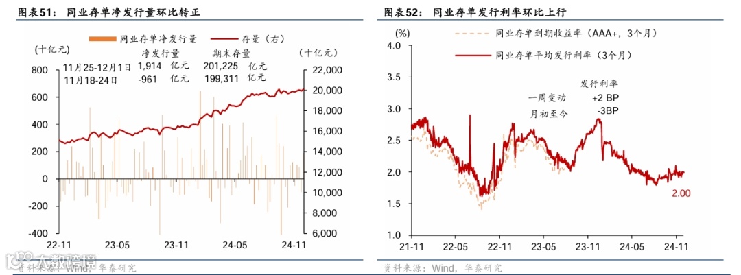 流动性指标:银行间流动性偏松,同业存单发行利率环比上行。银行间利率方面,DR007环比下行0.3个基点,R007环比下行0.9个基点。1年期国债收益率环比上行2个基点,10年期国债收益率环比下行6个基点,1年期和10年期国债收益率期限利差小幅收窄,国债收益率曲线小幅趋缓。上周央行质押式回购加权利率下行9.3个基点;同业存单净发行量环比上行,发行利率环比上行。