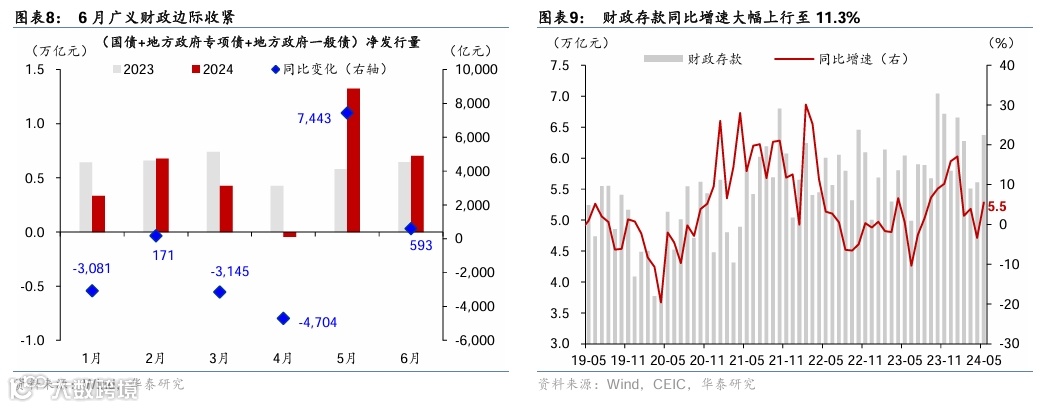 1)6月基建投资同比大幅提速、但月度数据或受历史数据“挤水分”等扰动、趋势上看2季度基建增速有所回落:6月基建投资同比增速从5月的3.8%明显上升至10.2%,5月财政边际宽松带来的资金效应或对6月基建形成一定支撑、亦可能反映历史数据挤水分和基数调整的扰动。2季度基建投资同比增速从1季度的3.7%小幅回落至2.9%。今年前6个月地方专项债发行进度(占全年计划比例)较1-5月的29.8%上行至上半年的38.3%、但仍慢于去年同期进度的60.6%。此外,6月全月,广义财政部门债券净发行8,587亿元,同、环比分别少增7,192、2,145亿元,显示6月以来财政政策较5月边际收紧,基建可持续的回升仍待广义财政发力,以及特别国债和专项债发行提速(图表8-9)。我们计算基建投资的口径亦包括电力、热力、燃气及水生产和供应业。