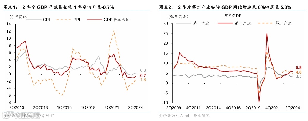 2024年2季度GDP实际增速较1季度的5.3%小幅回落至4.7%(彭博一致预期5%),名义GDP增速亦较1季度的4.2%小幅回落至4%,2季度GDP平减指数较1季度的-1.1%进一步收窄至-0.7%(图表1)。实际GDP季调环比增速从1季度的1.6%回落至0.7%、显示经济环比动能有所减速,金融业增加值数据“挤水分”等因素亦可能有所扰动。分产业看,1季度第二/三产业实际GDP同比增速从1季度的6%/5%略回落至5.8%/4.6%(图表2)。而根据统计局发布会,上半年货物和服务净出口对经济增长的贡献率为13.9%、对实际GDP的拉动约为0.7个百分点,人民币计价的贸易顺差同比从1季度的4.1%大幅上行至2季度的18.5%,我们估算的贸易顺差占2季度GDP约5.6%,较一季度的4.4%有所上升,对名义GDP增长贡献可能由一季度的0.2个百分点进一步上升0.8个百分点左右。