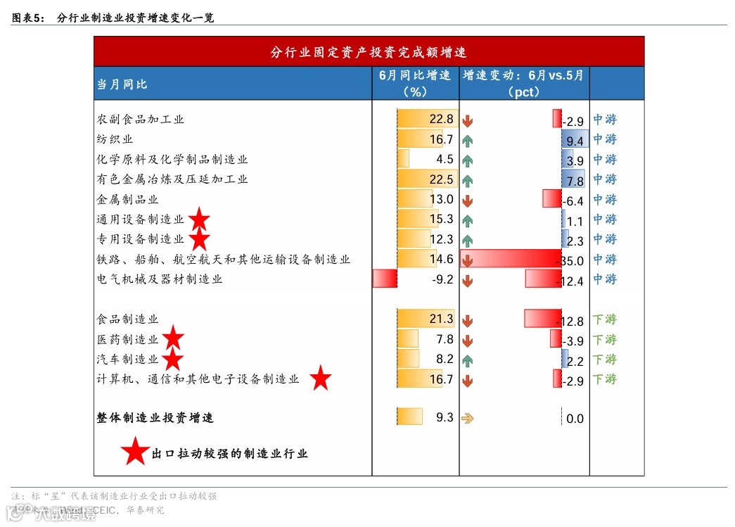 4)6月民间固定资产投资同比从5月的-0.4%转正至0.1%,而公共部门投资从5月的9.3%放缓至8%。