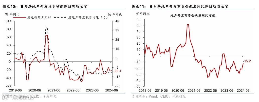 3)地产需求仍在“磨底”、低基数推动房地产投资降幅边际收窄——6月房地产开发投资同比降幅从5月的11%收窄至10.1%。低基数提振下、6月房地产销售面积/金额同比降幅从5月的20.7%/26.4%收窄至14.5%/14.3%,季节性调整后、地产销售面积/金额环比分别回落2.2%/0.3%,显示销售占比中一线城市的比例增长、整体居民购房意愿仍待提升;6月房地产到位资金同比降幅较5月的21.8%收窄至15.2%,主要由于按揭贷款/定金及预收款同比降幅从5月的42.1%/34.7%收窄至25.3%/22.4%、“517”地产组合拳或对房企融资带来一定支撑。而地产新开工面积同比降幅从5月的22.7%小幅收窄至21.7%、竣工面积同比降幅从5月的18.4%再度走阔至29.6%。总体而言,6月地产成交同比读数改善,主要受基数效应提振,一线城市二手房成交放量,可持续性仍待进一步观察。
