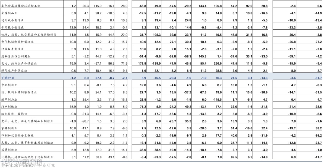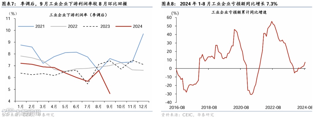 中游制造业利润同比降幅较8月的28.6%小幅收窄至24.4%,利润率(季调后)较8月持平于4%、但营收降幅较8月的1.4%略收窄至1%。有色冶炼和电气机械行业盈利增速分别从8月的-2.4%/-26.8%回升至6.6%/27.2%,共拉动整体工业企业盈利增速约1.9个百分点。但黑色冶炼/石油加工行业盈利降幅从8月的244.6%/132.4%走阔至314.1%/167.4%,二者对整体工业企业盈利增速的拖累均超过3个百分点,而金属制品/水泥制品/化工制造盈利同比分别录得-44.9%/-51.8%/-28.5%、仍在较弱区间,各自对整体工业企业盈利增速的拖累约1-2个百分点。