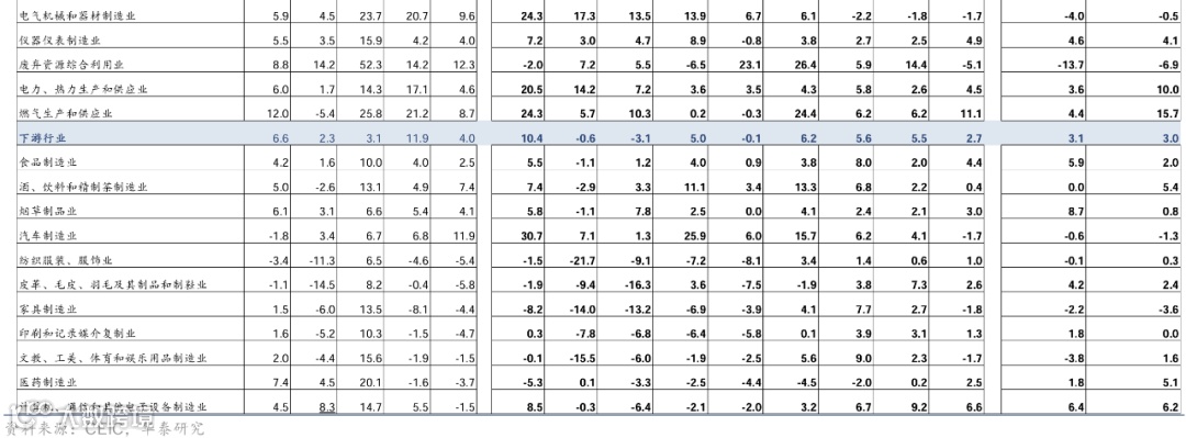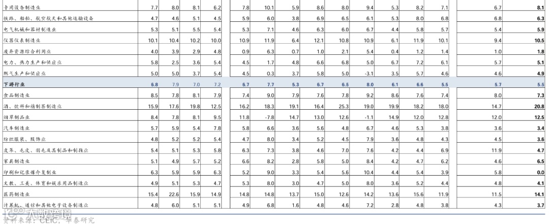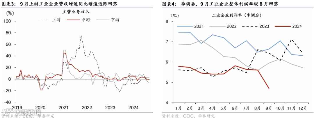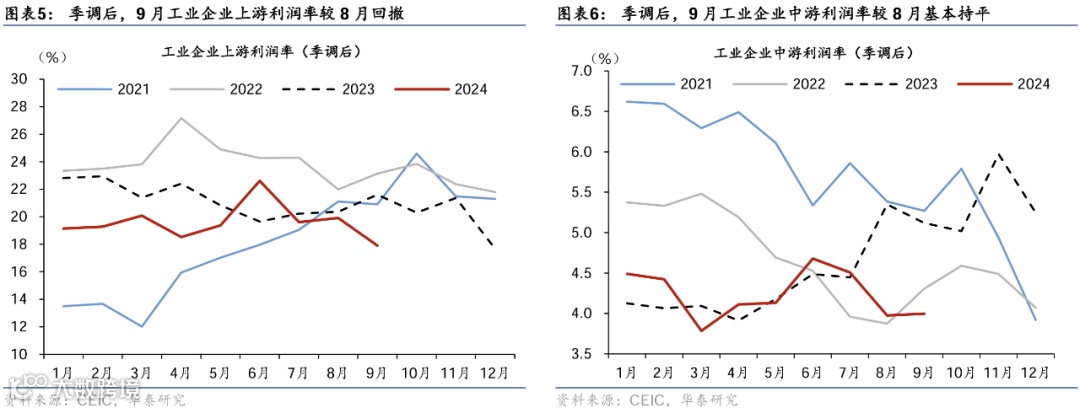 下游制造业利润同从8月-3.6%大幅回落至-31.7%,同期PPI同比降幅较8月的1.8%走阔至2.8%。量价拆分看,营业收入同比增速较8月的3.1%略回落至3%,但季调后的利润率从8月的6.6%大幅下行至4.6%、录得2012年以来的低位。其中,汽车制造利润降幅较8月的21.4%走阔至28.5%,对整体工业企业利润同比的拖累略走阔至1.6个百分点,利润率从8月的3.6%再度下探至3.4%,营业收入增速亦从8月的-0.6%回落至-1.3%。受高基数影响,计算机通信行业盈利同比从8月的6.9%回落至-41.7%,对工业企业利润增速的拖累约5.2个百分点。此外,医药、食品制造和烟草制造盈利同比较8月的4.5%/4.7%/6.4%小幅回落至-1%/-8.3%/4.7%,而家具盈利同比较8月的-19.7%上行至38.2%,主要受利润率同比改善推动。