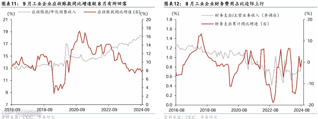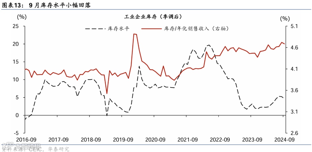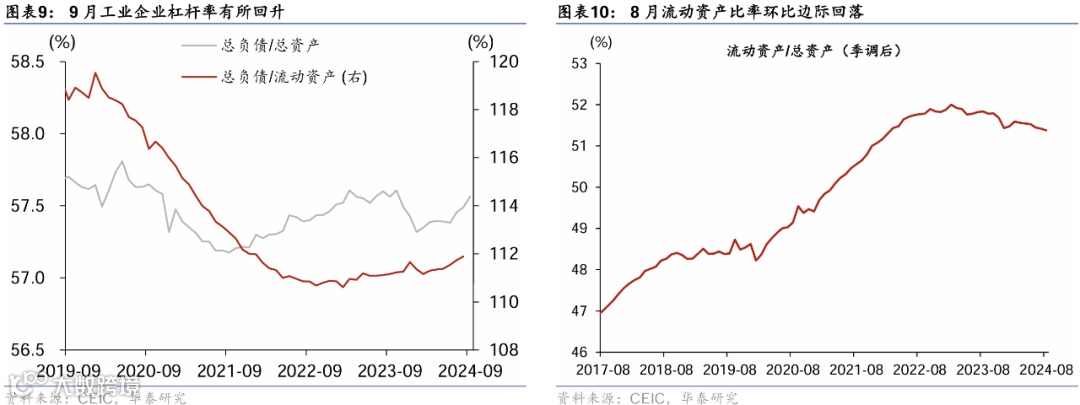 9月库存增速(季调后)从8月的5.2%回落至4.6%,或显示工业企业补库进程有所放缓;工业企业杠杆率(季调后)亦较8月回升、而应收账款占销售收入比例较8月有所下行。具体看,9月工业企业总体资产负债率较7月的57.5%上行至57.6%,应收账款(与销售收入)比率较8月的18.4%边际下行至9月的18.3%(图表9,11,13)。