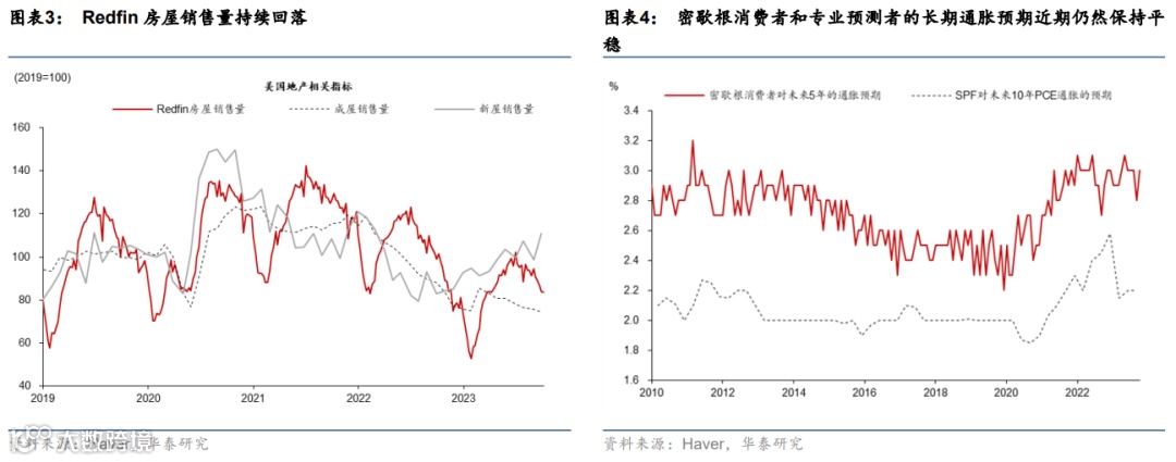 从增长动能来看,虽然三季度美国增长显著超预期,但四季度或明显减速。三季度美国GDP季环比折年为4.9%,高于彭博一致预期的4.5%。考虑到暑期消费高峰在四季度将消退,而学生贷款利息豁免结束以及政府关门风险高企,我们认为四季度美国增长动能或出现明显减速(参见《美国四季度增长或将明显减速》,2023/10/17)。近期数据显示,美国增长动能已有所回落:截至10月17日,美国BEA刷卡数据显示10月消费低于三季度均值(图表2);Redfin数据显示利率上升压制房屋销售(图表3);10月联储褐皮书显示,美国经济活动近期变化不大,增长整体稳定或略有疲软。