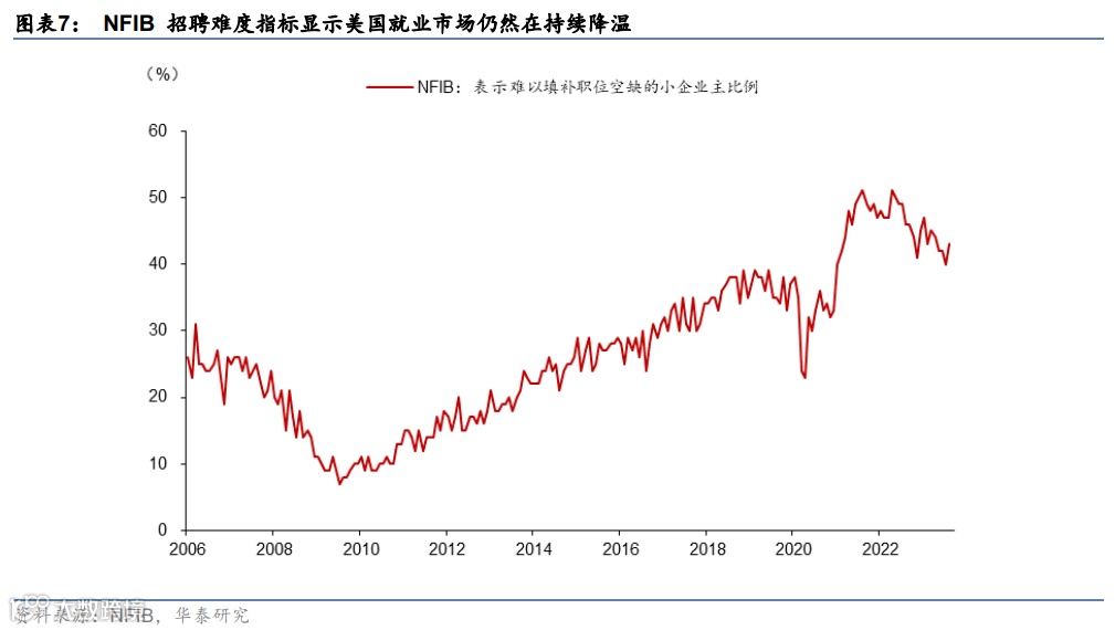 从通胀和劳工市场看,长期通胀预期小幅上行但整体稳定,劳工市场“再平衡”仍在持续。虽然8-9月美国核心CPI均录得0.3%,高于6-7月的0.2%,但主要受油价上行以及暑期消费需求强劲导致住房外核心服务较强的影响(参见《服务价格粘性支撑核心通胀》,2023/10/12),暂时未形成持续“威胁”。密歇根消费者和专业预测者的长期通胀预期近期仍然保持平稳(图表4),而5y5y远期盈亏平衡通胀率相对三季度均值上行0.1pct至2.8%,可能受到油价偏高影响。从劳工市场看,“再平衡”进程仍在持续。虽然9月新增非农超预期,但Indeed等高频数据指示岗位空缺持续回落(图表5);咨商会和 NFIB指标均显示美国就业市场仍然在持续降温(图表6和7)。