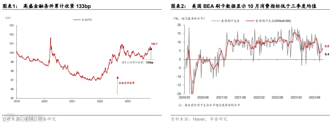 9月会议以来,美债利率上行,美股下跌,信用利差走阔导致美国金融条件持续收紧,相当于4-5次加息—这一变化明显降低了联储11月会议继续加息的必要性。8月1日至10月27日10年期美债收益率累计上行88bp,并一度突破5%;利率上行导致股市等风险资产承压、美元走强以及信用利差走阔,高盛金融条件累计收紧133bp(图表1),或拖累两个季度后增长约100bp。近期鲍威尔发言称,当前可以审慎加息,暗示短期不急于加息,等待四季度更多数据再做出决定,且近期收益率上升边际上能够替代联储加息。其他委员整体上也认同金融条件能够一定程度上替代美联储加息。