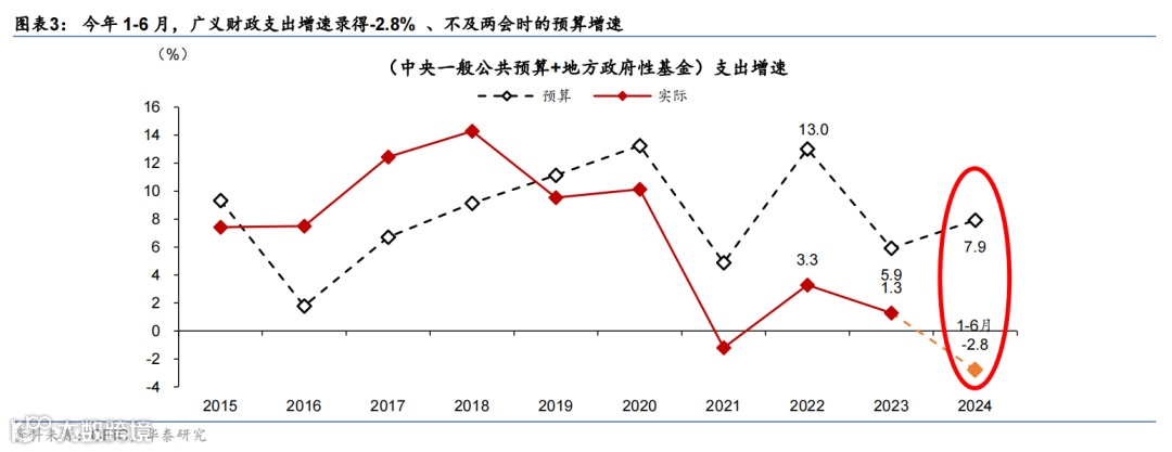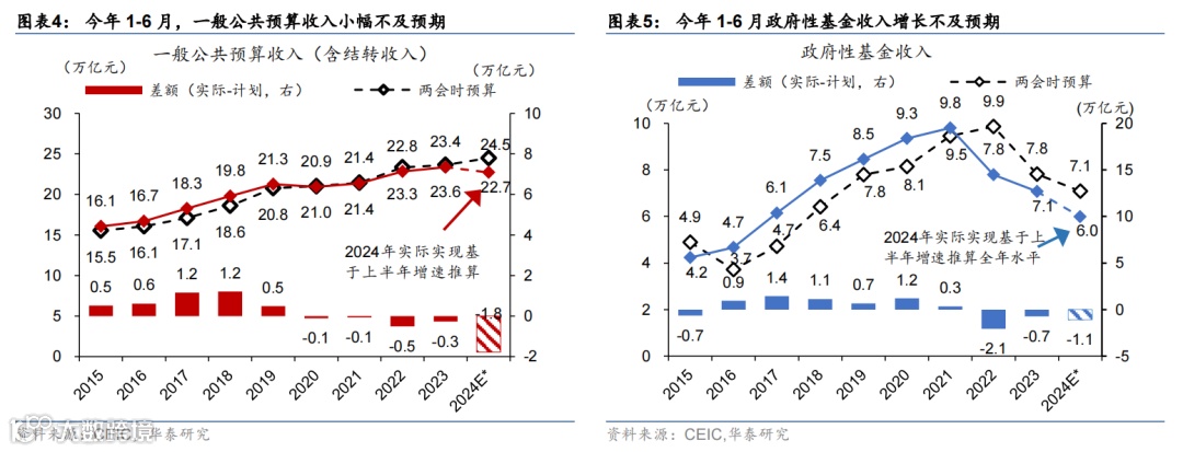 新一轮“以旧换新”政策下发的超长期特别国债资金,可能提振财政扩张效果,短期对居民耐用品消费带来提振,但从更广的货币财政政策组合而言,考虑3000亿规模仅占2023年一般公共预算支出的1%、杠杆效应可能较为有限,促进内需持续回升可能需要配合经济及居民收入预期的持续回升。2季度以来,财政支出增长明显减速,货币政策宽松也出现波折,所以,二季度经济增长较一季度有所减速,尤其是在6月消费和投资动能均走弱,鉴于7月政治局会议可能会再度评估2季度经济表现及对政策进行调整和纠偏,我们认为目前至8月可能是政策调整“窗口期”。三中全会明确提出“坚定不移实现全年经济社会发展目标”,本周央行降息、货币政策边际宽松——小幅下调7天逆回购利率与LPR报价10个基点、SLF利率10个基点,并降低MLF利率20个基点。而在广义财政收入承压的情况下,亦需要加大广义的财政赤字,才能更好发挥财政扩张支持经济增长的功能——今年1-6月,广义财政支出(一般公共预算+地方政府性基金)增速为-2.8%(图表3),较年初两会制定的7.9%的预算仍有一定差距,主要由于政府性基金收入不及预期(图表4-5),同时预算赤字的限制,叠加更严格的资金使用监管,导致支出增长动力不足,财政政策或仍需进一步、更全方位的加力增效,方能重回扩张区间,即增速回升至超过名义GDP增速。关注7月底政治局会议关于逆周期调节的表述。