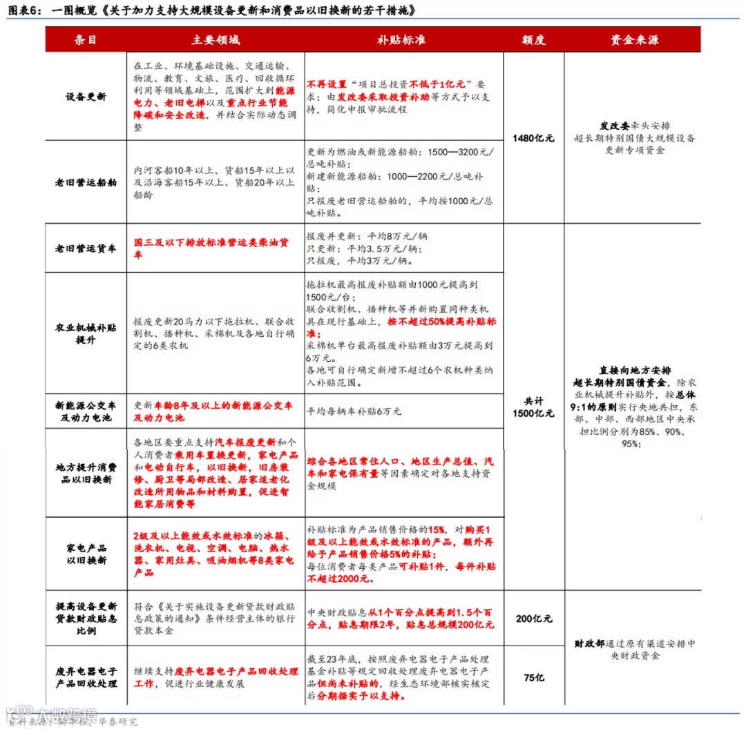 新一轮“以旧换新”政策发布,比起此前多轮类似政策,本轮有“范围广,数额大”的特点:中央财政明确提供3000亿左右超长期特别国债支持(金额约占23年全年一般公共预算支出的1%),部分领域按照9:1的比例实行央地共担。7月25日,国家发改委、财政部印发《关于加力支持大规模设备更新和消费品以旧换新的若干措施》,统筹安排3000亿左右超长期特别国债加力支持大规模设备更新和消费品以旧换新,该政策较今年3月13日国务院印发的《推动大规模设备更新和消费品以旧换新行动方案》,拓宽了设备更新以及以旧换新的支持范围、并明确了资金来源及中央层面的补贴总额,降低了超长期特别国债资金申报门槛,不再设置“项目总投资不低于 1 亿元”要求等。具体而言(图表6):