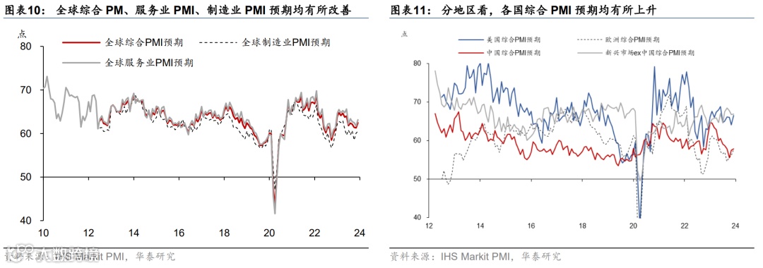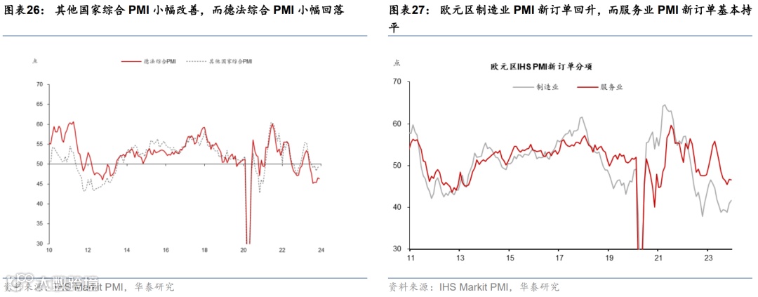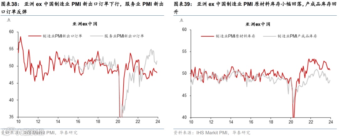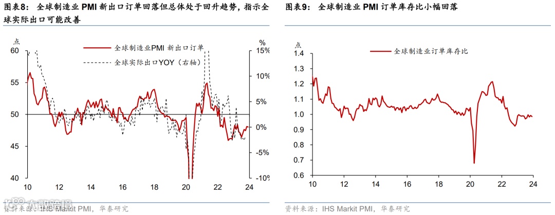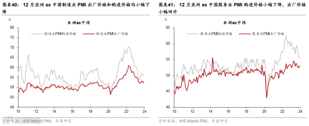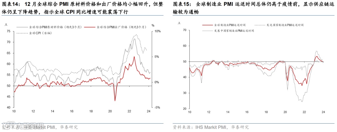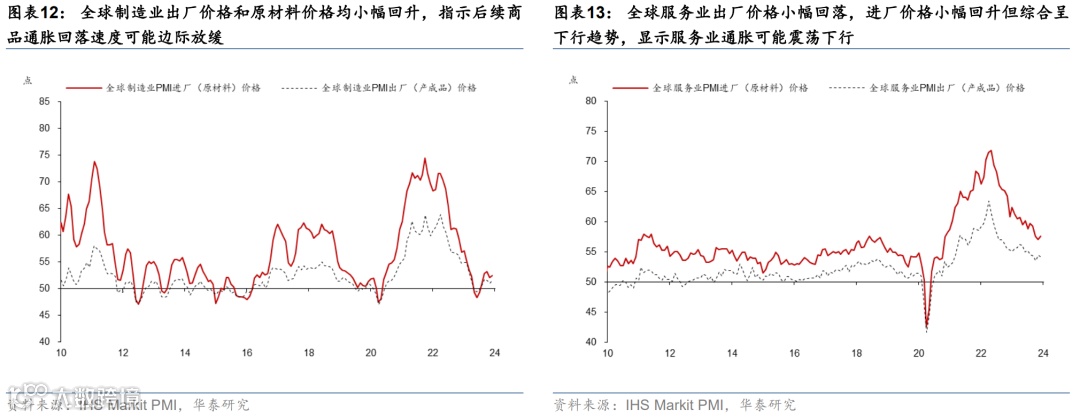 全球制造业PMI原材料价格和出厂价格分项分别回升0.4pp、0.6pp至52.4和51.5,可能与红海冲突有关,但整体仍处于下降趋势。