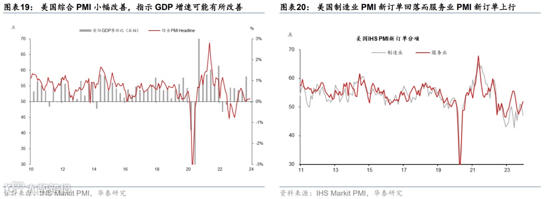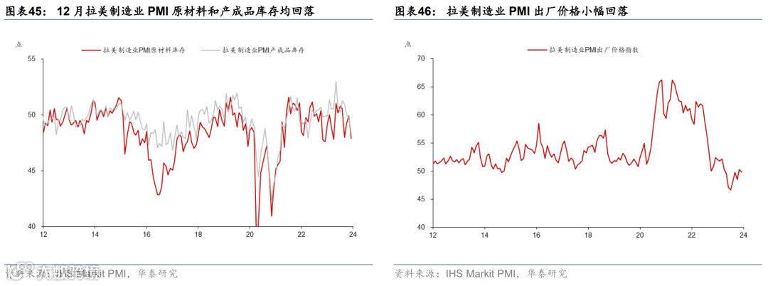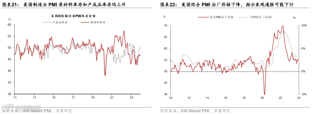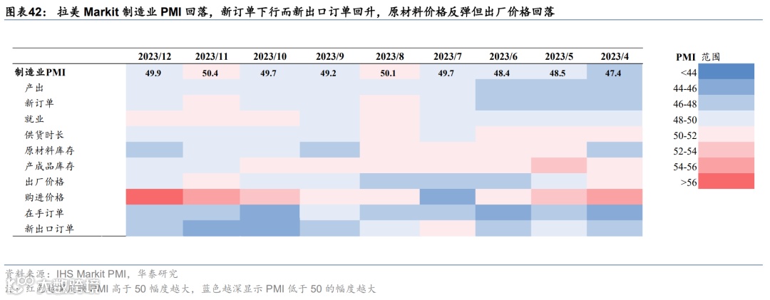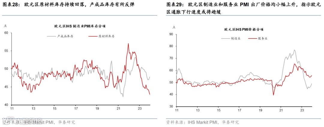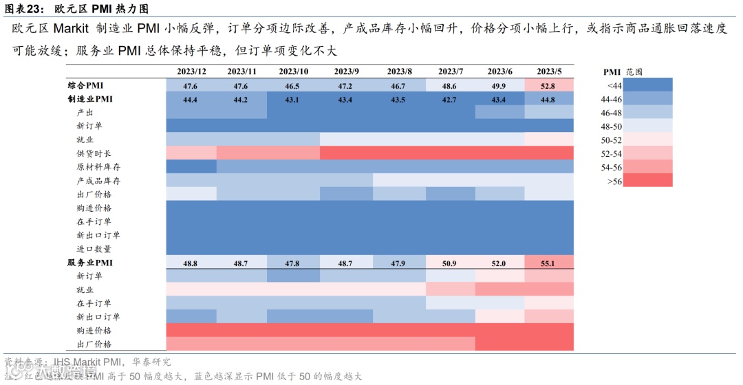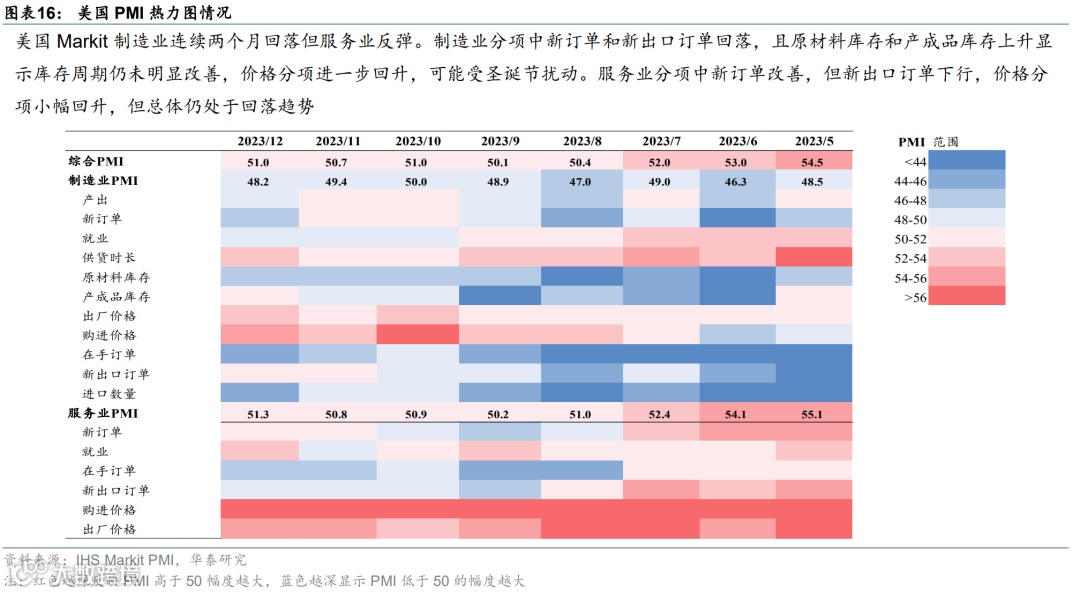 全球制造业PMI原材料价格和出厂价格分项分别回升0.4pp、0.6pp至52.4和51.5,可能与红海冲突有关,但整体仍处于下降趋势。