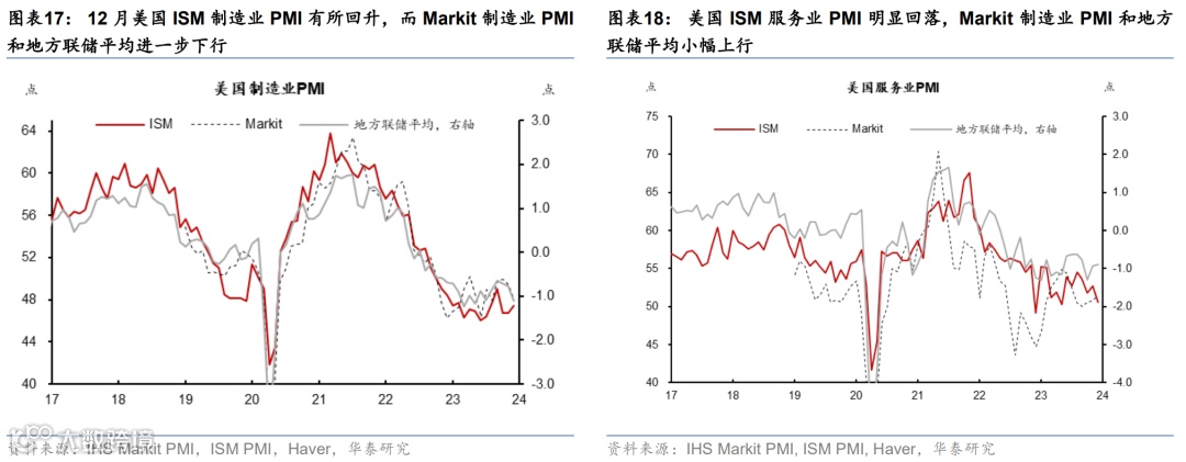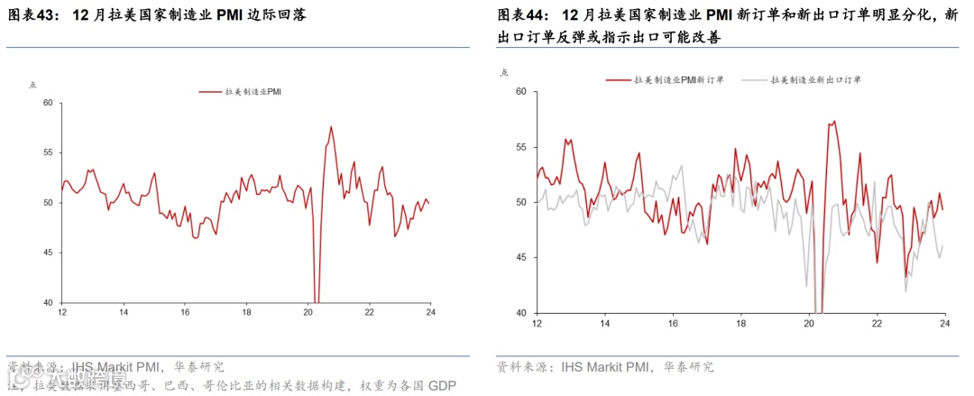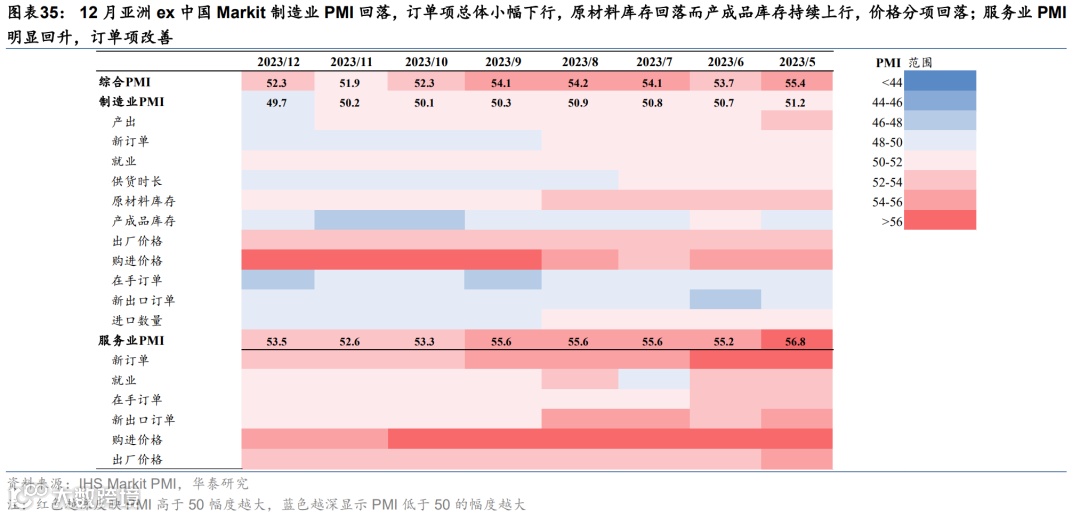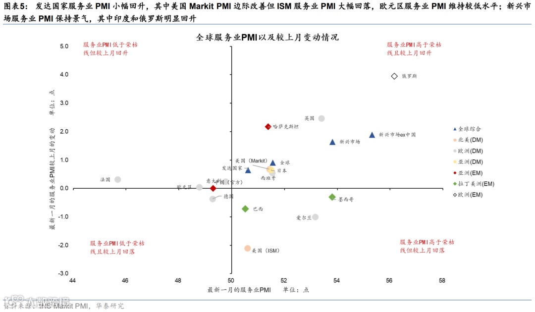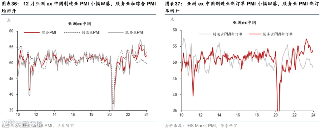 12月全球服务业PMI回升1.0pp至51.6,连续两个月回升,或受暖冬提振。发达国家中,美国上升0.6pp至51.4(但ISM大幅下行2.1pp至50.6),欧、日分别上行0.1pp、0.7pp至48.8、51.5,英国上升2.5pp至53.4;新兴市场ex中国回升1.9pp至55.3,绝对水平显著超过发达经济体(50.6),俄罗斯(+2.1pp)、印度(+4pp)改善幅度较大。