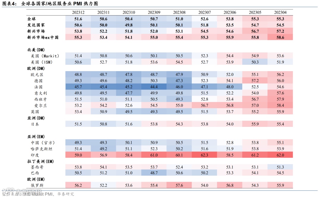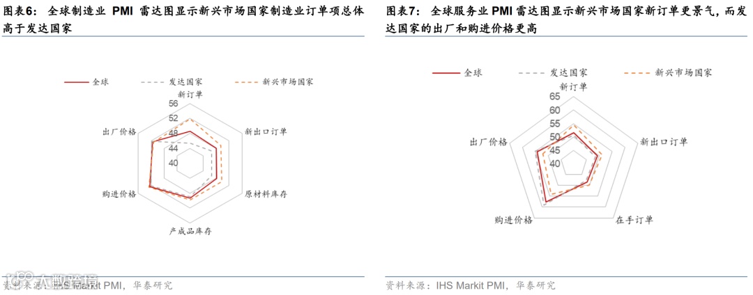 全球服务业PMI原材料价格上行0.6pp至57.6,而出厂价格小幅回落0.2pp至54.2。