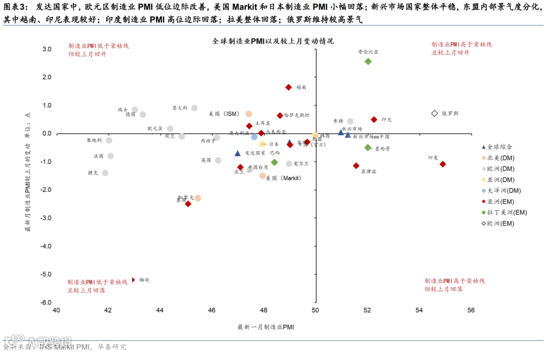 12月全球制造业PMI小幅回落0.3pct至49.0,连续16个月低于荣枯线。其中,美国Markit PMI从49.4回落至47.9(ISM回升0.7pp至47.4),欧元区小幅上行0.2pp至44.4,但仍然偏低;日韩小幅走弱;新兴市场ex中国变动不大,印度、印尼、俄罗斯表现偏强。 -