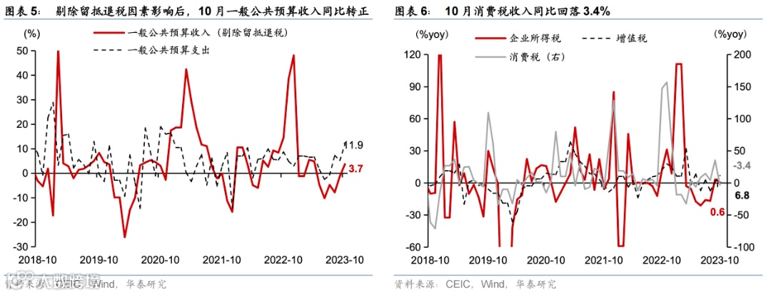 但个人所得税虽然同比降幅从3.3%小幅收窄至1.4%,但两年复合增速则从9月的3.7%回落至0.7%,个人收入的改善或仍待观察。此外,出口退税同比增速从12.8%的高增长回落至5.9%,2年复合增速亦呈现小幅回落。