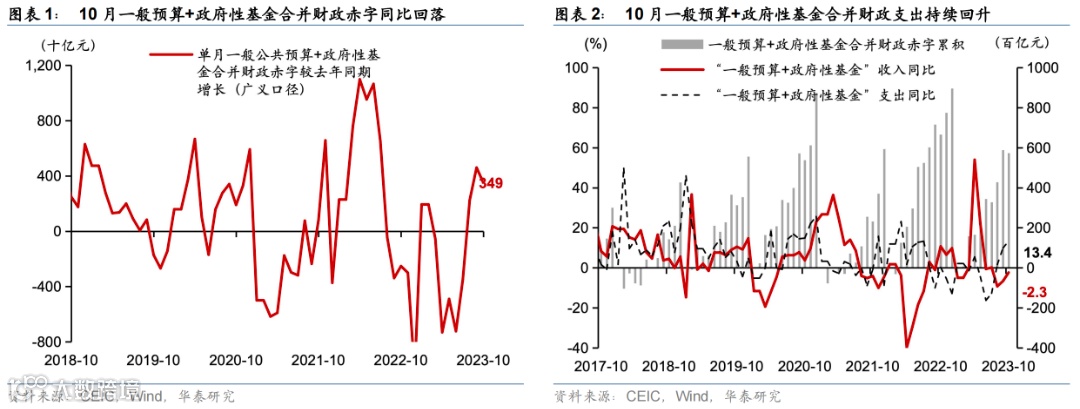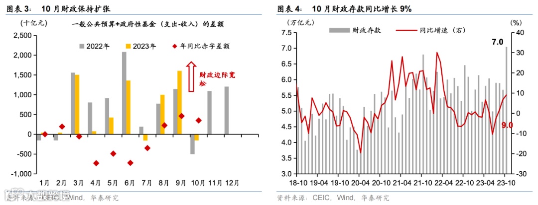 整体而言,“一般预算+政府性基金”赤字录得-1530亿元,赤字呈现季节性的回落,但较去年同期同比多增3490亿元,显示扩张态势延续。“一般预算+政府性基金”收入同比降幅从9月的6.7%收窄至2.3%,支出同比则从9月的9.9%再加速至13.4%,2年复合增速来看增长更为明显——“一般预算+政府性基金”收入和支出的增速分别从9月的-3.9%/-0.6%回升至4%/6.6%。拆分看:10月一般公共预算录得赤字-2944亿元,较去年10月赤字-4301亿元同比小幅扩张,而10月政府性基金赤字的扩张力度有所提升,从去年10月的-717亿元扩张至1419亿元。此外,10月财政存款环比回升1.37万亿元、同比多增5828亿元,财政存款同比增速从9月的6.8%明显抬升至9%,或对财政支出增长带来制约。