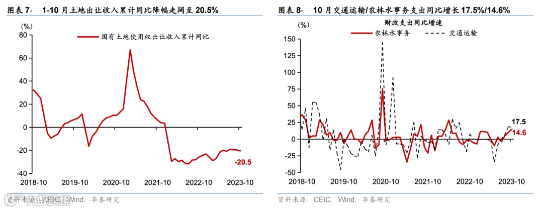低基数提振下一般公共预算支出同比回升,政府性基金支出同比有所回落。10月一般公共预算支出同比从9月的5.2%上行至11.9%,两年复合增速亦从9月的5.3%上行至10.3%。分类别看,教育、农林水事务、节能环保支出的同比增速分别从9月的2.7%/10.1%/-2.4%明显回升至13.7%/14.6%/21%。政府性基金支出同比增速从9月的26.1%回落至17.7%,但两年复合降幅从9月的13.3%收窄至1.9%。