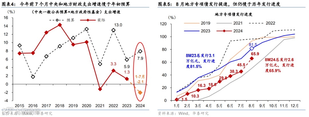 同时,近期财政力度出现边际加速迹象。然而,9-10月可能是财政政策进一步、更大幅度调整的“窗口期”,而货币政策亦可能进一步宽松,这些边际变化对市场信心亦有一定的提振作用。7月中央+地方财政支出从6月-4.9% 的同比增速提升至7月的+3.7% 。然而,今年3-6月财政支出增长明显滞后,同比月均下降1.3%。 另一方面,今年1-7月中央+地方财政支出仍同比下降2.1%,明显低于年度预算中+7.9% 的同比增长——考虑到年度财政总支出预算为28万亿元,目前年化支出进度滞后近3万亿人民币(图表4)。而支出大幅不及预算,主要受财政收入增长偏弱制约、尤其是地方政府收入下行的拖累较为明显。因此,市场对增加预算赤字或国债额度的预期明显上升。与此同时,虽然8月地方专项债发行有所加速,但发行进度仍慢于往年同期,后续可能会继续提速(图表5)。考虑到年度调整预算/增发国债的窗口期在9-10月,而今年预算赤字对财政宽松的制约已经较为明显,所以,市场憧憬财政政策边际调整,并部分反应7月财政立场的边际变化,也在情理之中。货币政策方面,近期央行多次表示要加强逆周期调节,并研究储备增量政策举措。若美联储9月降息,也打开了国内货币政策宽松、尤其是降息的空间。若存量房贷利率能够调整,对地产周期可能有边际提振。