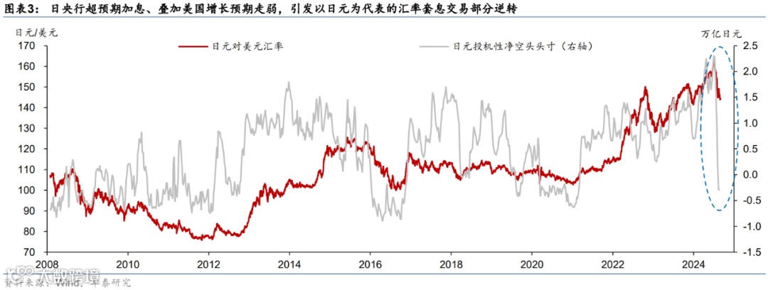 近期美联储降息预期升温,叠加此前日元急速走强,以日元为代表的汇率套息交易部分逆转,对亚洲货币、尤其是低息货币的提升尤为明显。随着美国经济数据走弱,8月下旬的杰克逊霍尔(Jackson Hole)会议进一步释放了美联储9月即将降息、且稳增长稳就业紧迫感上升的清晰信号(参见《联储主席年会讲话:降息之迫切溢于言表》,2024/8/24)。另一方面,7月31日日央行超预期加息,叠加美国增长预期走弱导致美日利差急速收窄,明显推升日元,引发部分套息交易逆转(图表3)。除日元外,由于美中利差今年走阔,人民币套息交易的存量也有所上升。截至8月26日,新加坡和香港交易所人民币期货的未平仓头寸合计约230亿美元(约合1,640亿元)。日元套息交易部分逆转,同为低息货币的人民币汇率同时走强,7月31日以来人民币兑美元汇率累计升值2.2%,而兑一篮子汇率的CFETS指数下跌1.4%。