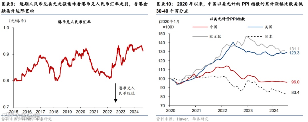 人民币汇率升值边际提升香港资产吸引力。近期人民币兑港币汇率走强,对中国香港这个小型开放经济体而言,无疑是起到了货币/金融条件宽松的作用。某种意义上,港币有效汇率(即兑人民币汇率)贬值,边际缓解香港本地的资产价格下行压力。由此,人民币和海外人民币资产之间,近日开始出现一定程度上的“正循环”效应。因为中国香港最大的贸易伙伴是中国内地,其名义有效汇率走势主要取决于港币兑人民币汇率。由于港币与美元挂钩,人民币兑美元走强意味着港币兑人民币汇率走弱,由此香港金融条件边际宽松(图表9)。在联系汇率(即货币发行局,currency board)制度下,香港主要通过本地物价及资产价格的变化来调节其相对竞争力,所以金融条件宽松有助于减轻香港本地的资产价格下行压力(参见《“撤辣”后香港楼市的热度可持续、可复制吗?》,2024/3/18)。